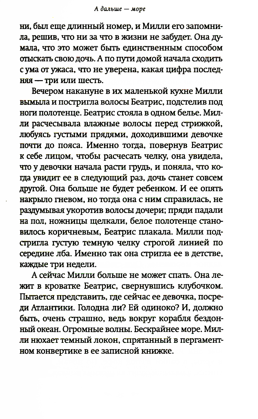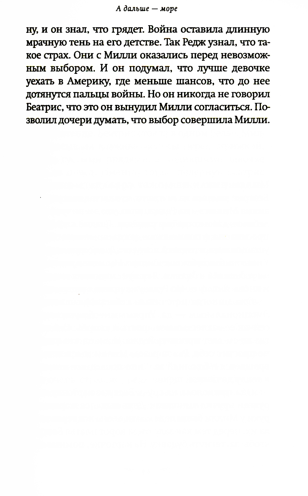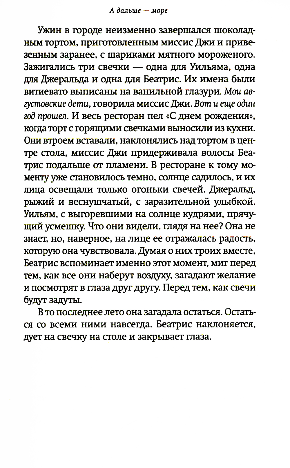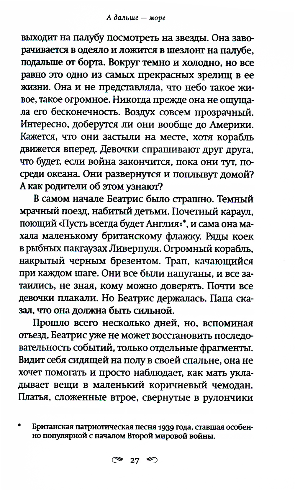 Когда в 1940-м на Лондон начинают падать немецкие бомбы, Милли и Реджинальд Томпсон решаются на трудный шаг: они отправляют свою одиннадцатилетнюю дочь Беатрис за океан, в безопасную Америку. Там ей предстоит жить в чужой семье, пока не закончится война. Напутанная, злая на родителей, одинокая и потерянная, Беа прибывает в страну, столь отличную от мрачного военного Лондона. Мистер и миссис Джи, а также их сыновья Уильям и Джеральд радушно принимают англичанку, и вскоре она становится своей в этом новом мире, частью счастливой семьи. Идет время, война никак не затихнет, и Беа уже кажется, что нет ничего естественней, чем тихая, спокойная жизнь здесь, в большом и уютном доме, и полные веселья летние месяцы на крошечном острове. Сумрачный Лондон, вечно усталые родители начинают казаться ей чем-то далеким, но все же Беа не хочет забывать свое детство, свои корни. И она возвращается домой, однако память о ее американской семье навсегда в сердце Беа, и именно эти воспоминания направляют ее по жизни. «А дальше - море» - роман, полный солнца и тумана, острого счастья и томительной боли, прощения и понимания, потерь и любви.| Издательство | Фантом Пресс |