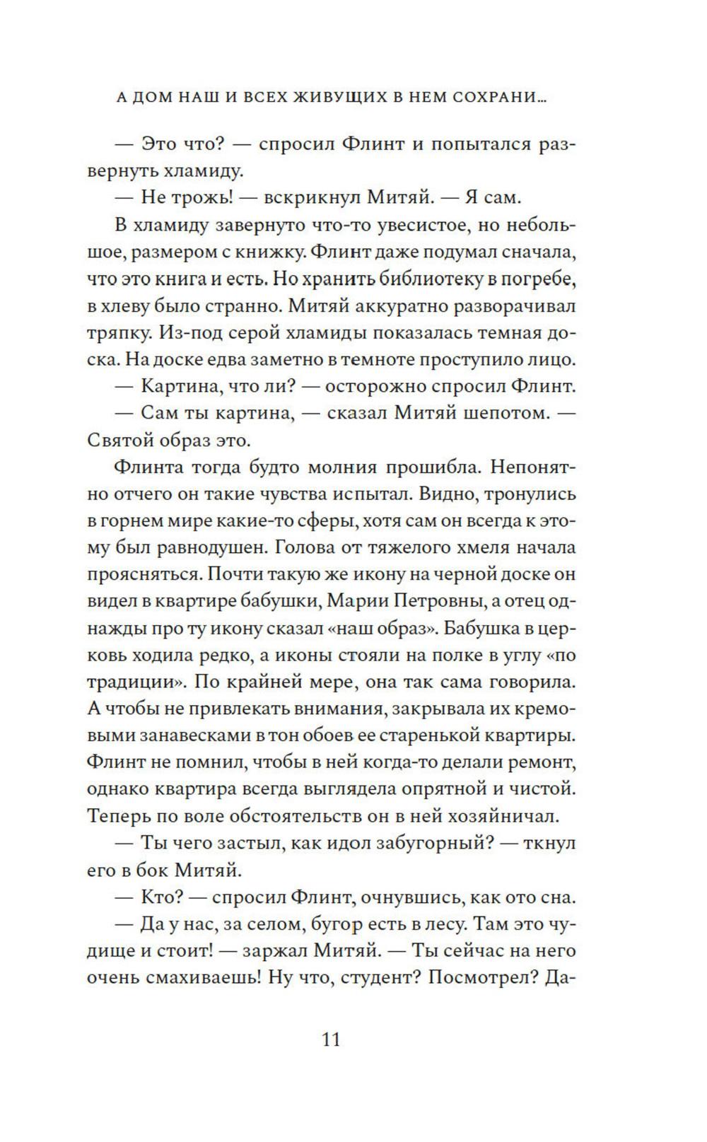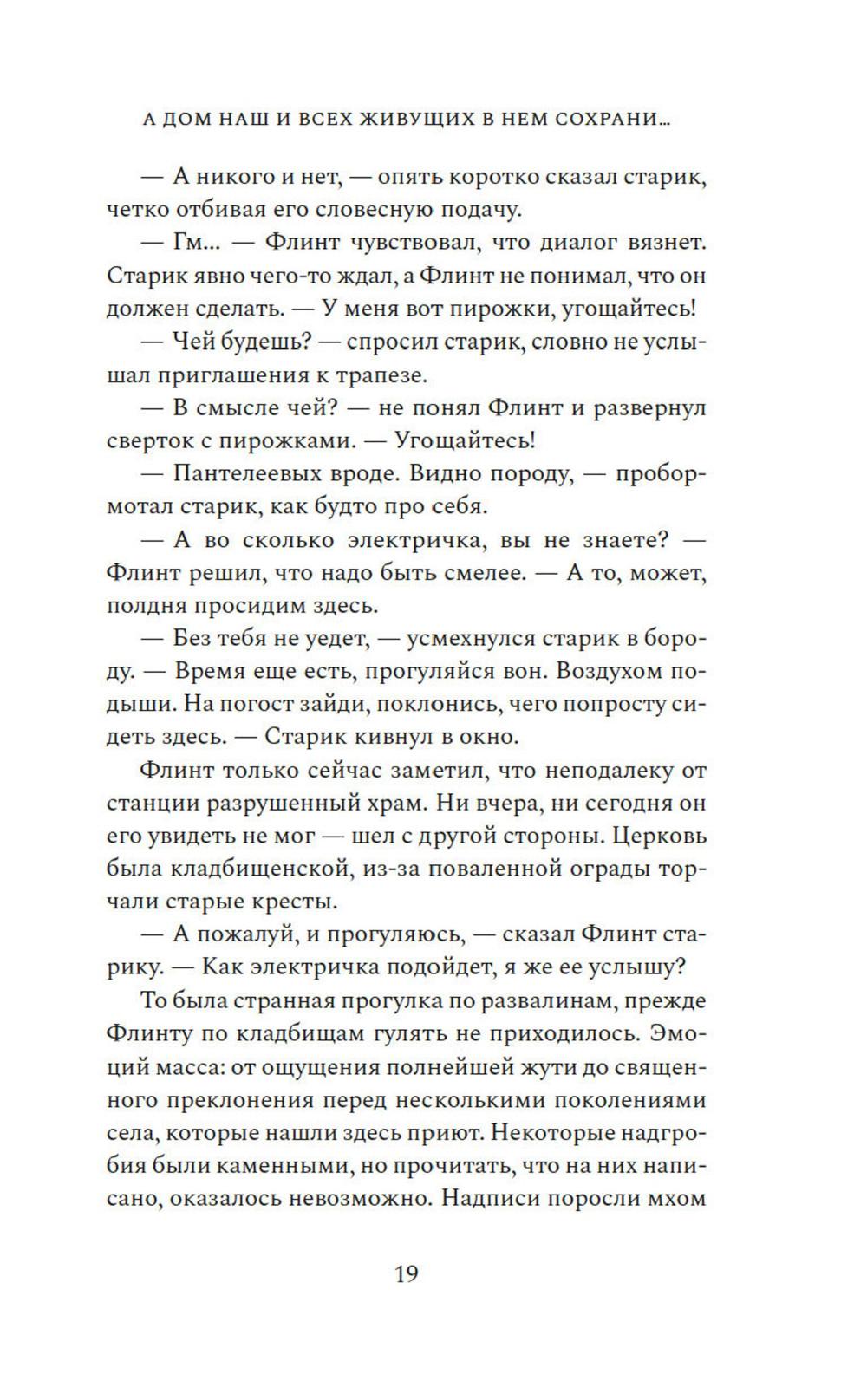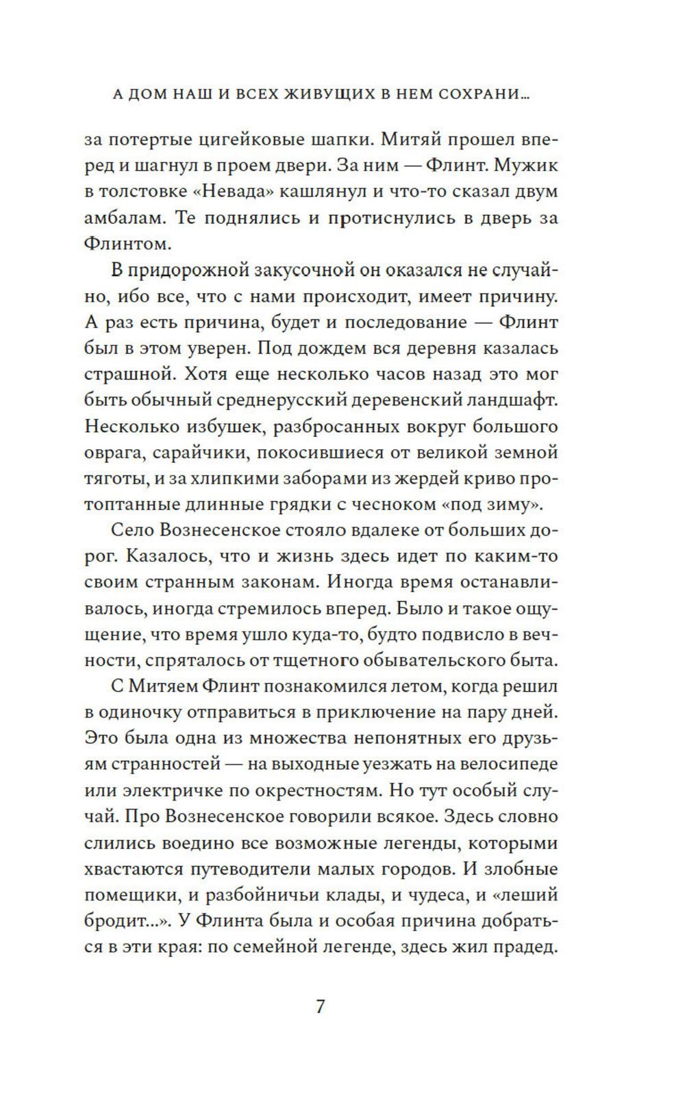 Жизнь казака Платона Пантелеева дала трещину в 1918 году: два сына разошлись по разные стороны революции: Василий ратовал за новый мировой порядок, а Петр оказался в отступающей Белой армии. Устав от братской вражды и непримиримости, Платон в сердцах разрывает семейную реликвию - икону-складень со Спасом и Богородицей, и вручает ее части сыновьям. Спустя сто лет московский студент Флинт приезжает в село Вознесенское, чтобы узнать о прошлом своей семьи, которое давно обросло легендами. Китай и Южная Африка, Аргентина и Америка - где только не пришлось пожить его предкам. Так рассказывал ему отец. Жаль, что уже не спросишь у него, где тут сказка, а где правда. Флинт, а точнее - Платон Пантелеев, еще не знает, что в этом старинном селе суждено соединиться семейному образу и двум ветвям одной разрозненной семьи, к которой он и принадлежит. «А дом наш и всех живущих в нем сохрани...» - удивительная семейная сага, протянувшаяся сквозь века и континенты, о потомках казака Платона Пантелеева, о непримиримой братской вражде, а еще о силе кровных уз и, несомненно, о любви - всепрощающей, жертвенной.| Издательство | Азбука |