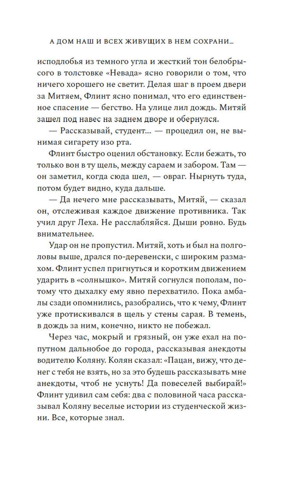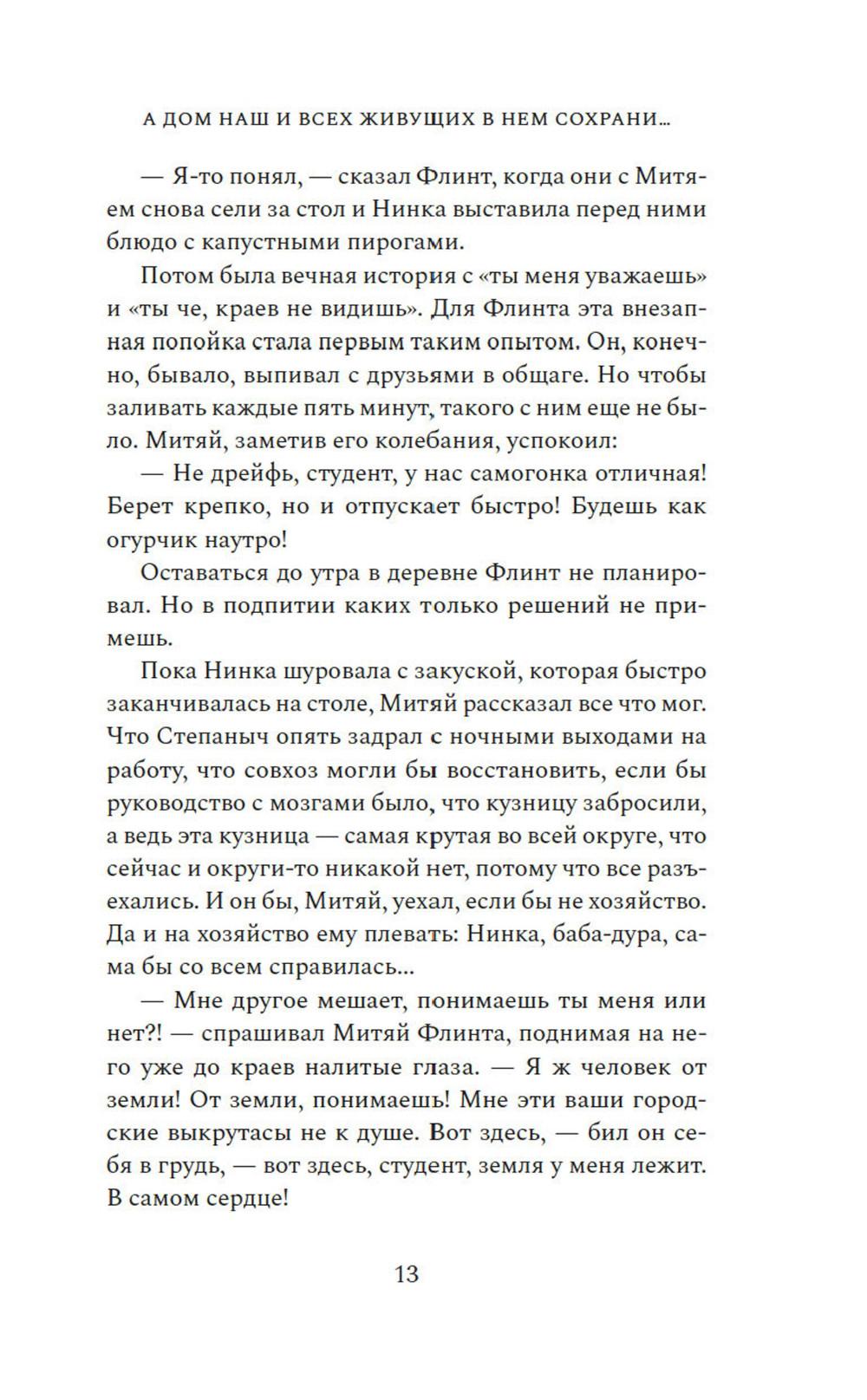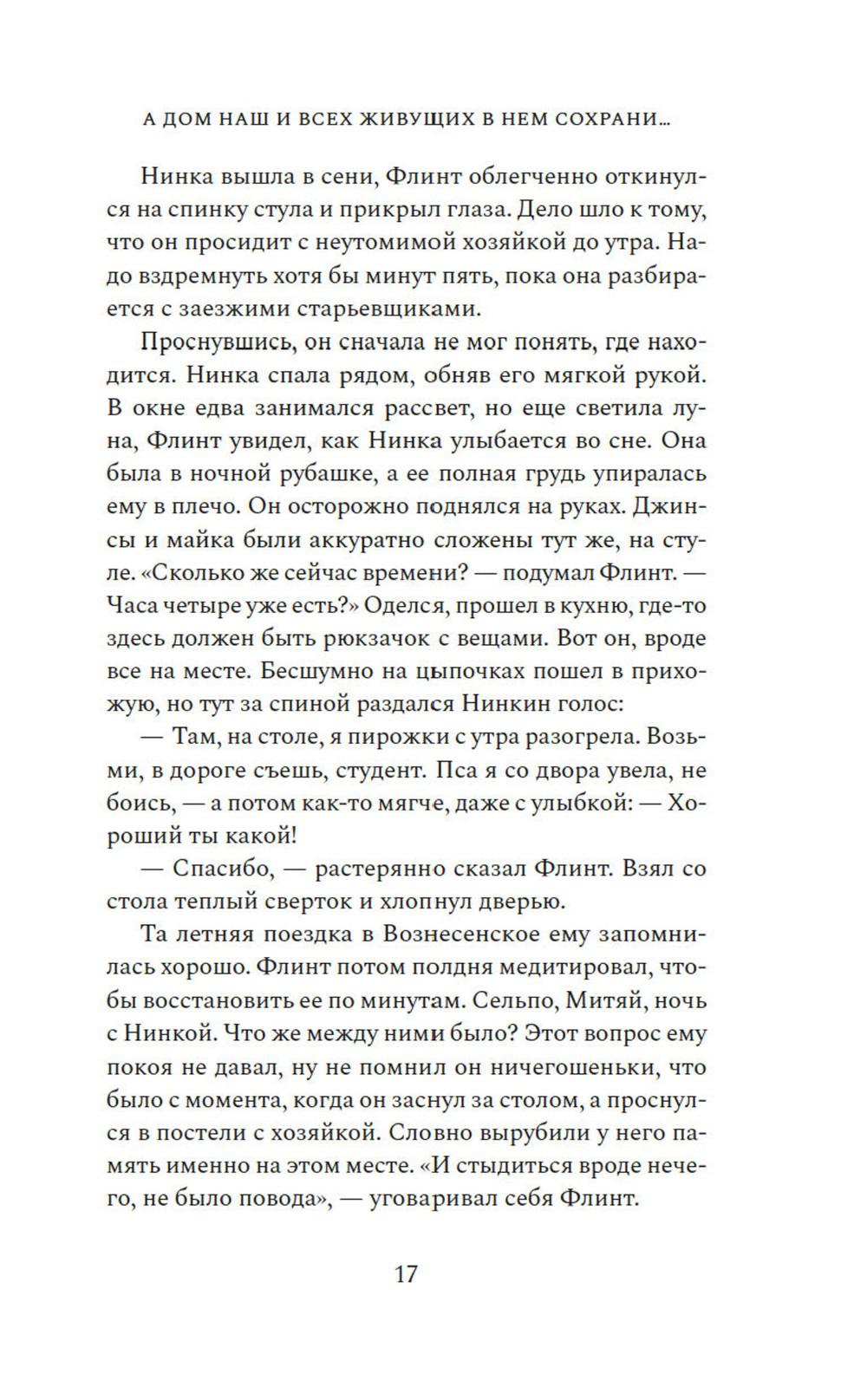 Жизнь казака Платона Пантелеева дала трещину в 1918 году: два сына разошлись по разные стороны революции: Василий ратовал за новый мировой порядок, а Петр оказался в отступающей Белой армии. Устав от братской вражды и непримиримости, Платон в сердцах разрывает семейную реликвию - икону-складень со Спасом и Богородицей, и вручает ее части сыновьям. Спустя сто лет московский студент Флинт приезжает в село Вознесенское, чтобы узнать о прошлом своей семьи, которое давно обросло легендами. Китай и Южная Африка, Аргентина и Америка - где только не пришлось пожить его предкам. Так рассказывал ему отец. Жаль, что уже не спросишь у него, где тут сказка, а где правда. Флинт, а точнее - Платон Пантелеев, еще не знает, что в этом старинном селе суждено соединиться семейному образу и двум ветвям одной разрозненной семьи, к которой он и принадлежит. «А дом наш и всех живущих в нем сохрани...» - удивительная семейная сага, протянувшаяся сквозь века и континенты, о потомках казака Платона Пантелеева, о непримиримой братской вражде, а еще о силе кровных уз и, несомненно, о любви - всепрощающей, жертвенной.| Издательство | Азбука |