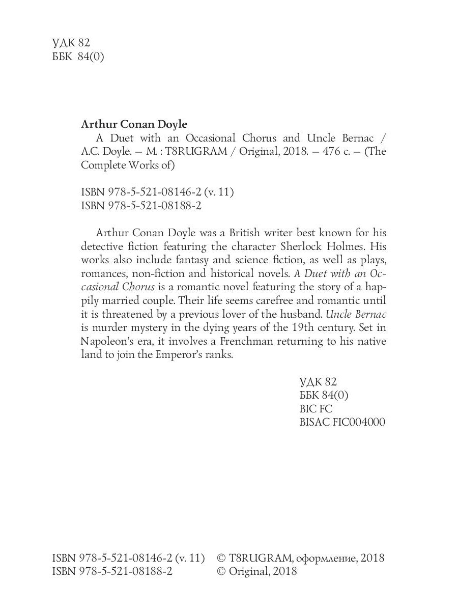 Arthur Conan Doyle was a British writer best known for his detective fiction featuring the character Sherlock Holmes. His works also include fantasy and science fiction, as well as plays, romances, non-fiction and historical novels. A Duet with an Occasional Chorus is a romantic novel featuring the story of a happily married couple. Their life seems carefree and romantic until it is threatened by a previous lover of the husband. Uncle Bernac is murder mystery in the dying years of the 19th century. Set in Napoleon's era, it involves a Frenchman returning to his native land to join the Emperor's ranks.| Издательство | Т8 RUGRAM |