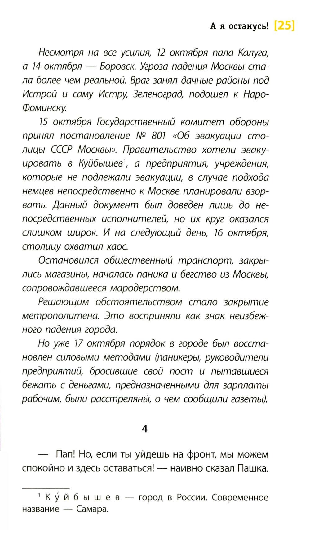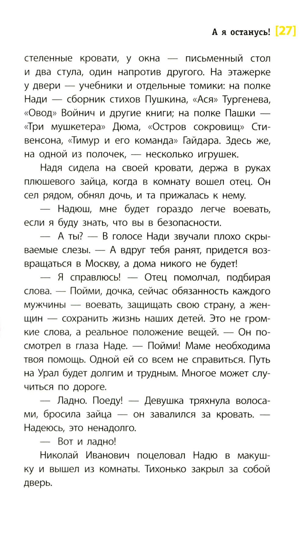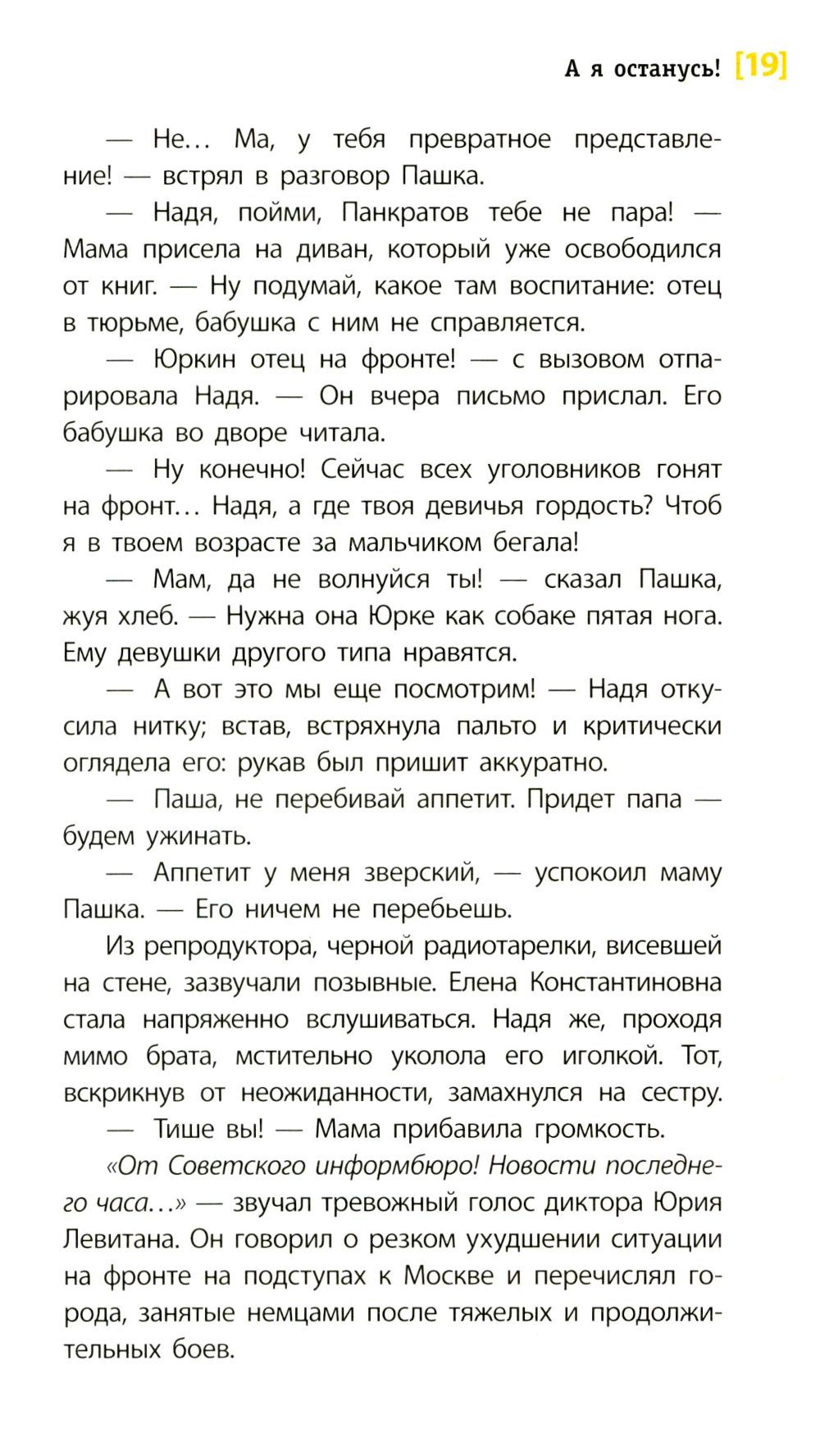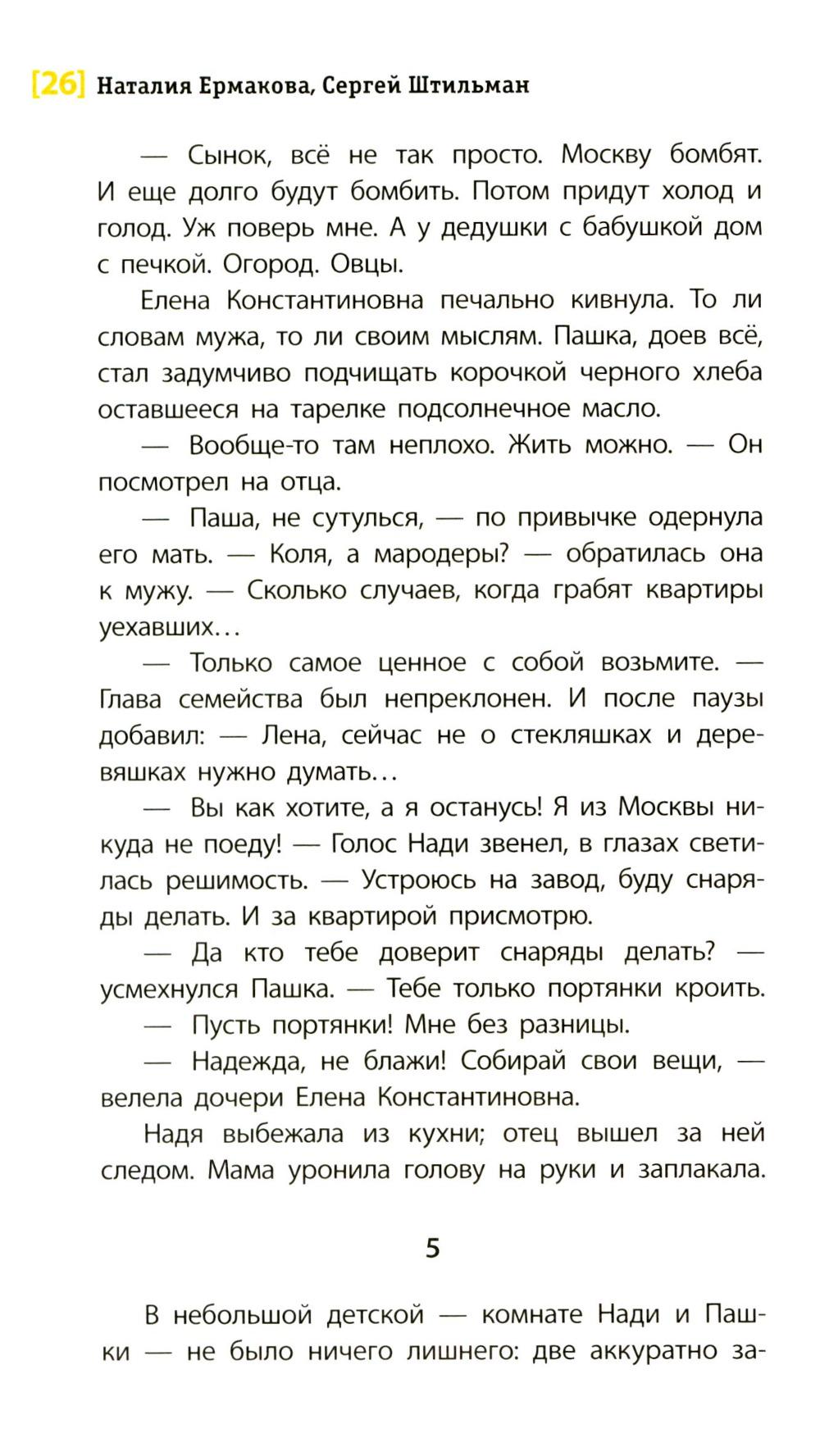 Москва. Октябрь 1941 года. Немцы рвутся к столице. Из города эвакуируются крупные предприятия, многие жители Москвы стараются уехать в глубокий тыл. Собирается в эвакуацию и семья пятнадцатилетней Нади Елисеевой, но девушка решает остаться… из-за соседского паренька Юрки Панкратова, в которого она влюблена. Теперь ей самой придется решать множество проблем: устраиваться на работу, налаживать свой быт в сложных условиях военного времени, заботиться о маленькой сестренке Юрки и его старой бабушке. Провожать его на фронт. Какой была Москва в военное время? Какими были будни и праздники москвичей? Книга основана на реальных событиях.| Издательство | Детская литература |
