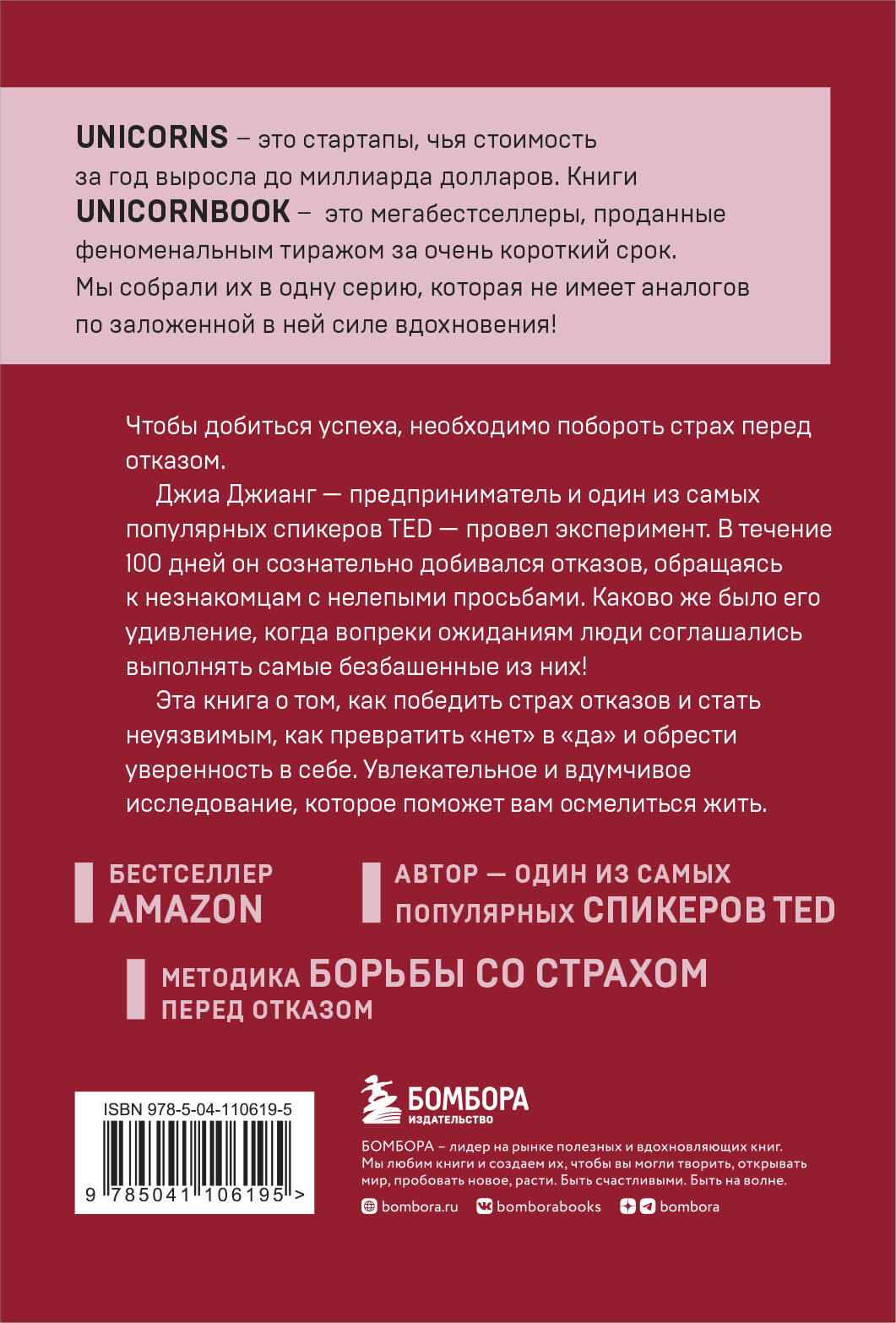 Чтобы добиться успеха, необходимо побороть страх перед отказом. Огромное количество гениальных идей и стоящих решений умирает только потому, что их не решились озвучить. Страх быть отвергнутым, боязнь насмешки, нерешительность - всё это останавливает тех, кто мог бы создать что-то уникальное. Джиа Джианг, предприниматель и один из самых популярных спикеров TED, провел эксперимент. В течение 100 дней он сознательно добивался отказов, обращаясь к незнакомцам с нелепыми просьбами. Каково же было его удивление, когда, вопреки ожиданиям, люди соглашались выполнять самые безбашенные из них! Эта книга о том, как победить страх отказов и стать неуязвимым, как превратить «нет» в «да» и обрести уверенность в себе. Увлекательное и вдумчивое исследование, которое поможет вам осмелиться жить.| Издательство | ООО "Издательство "Эксмо" |