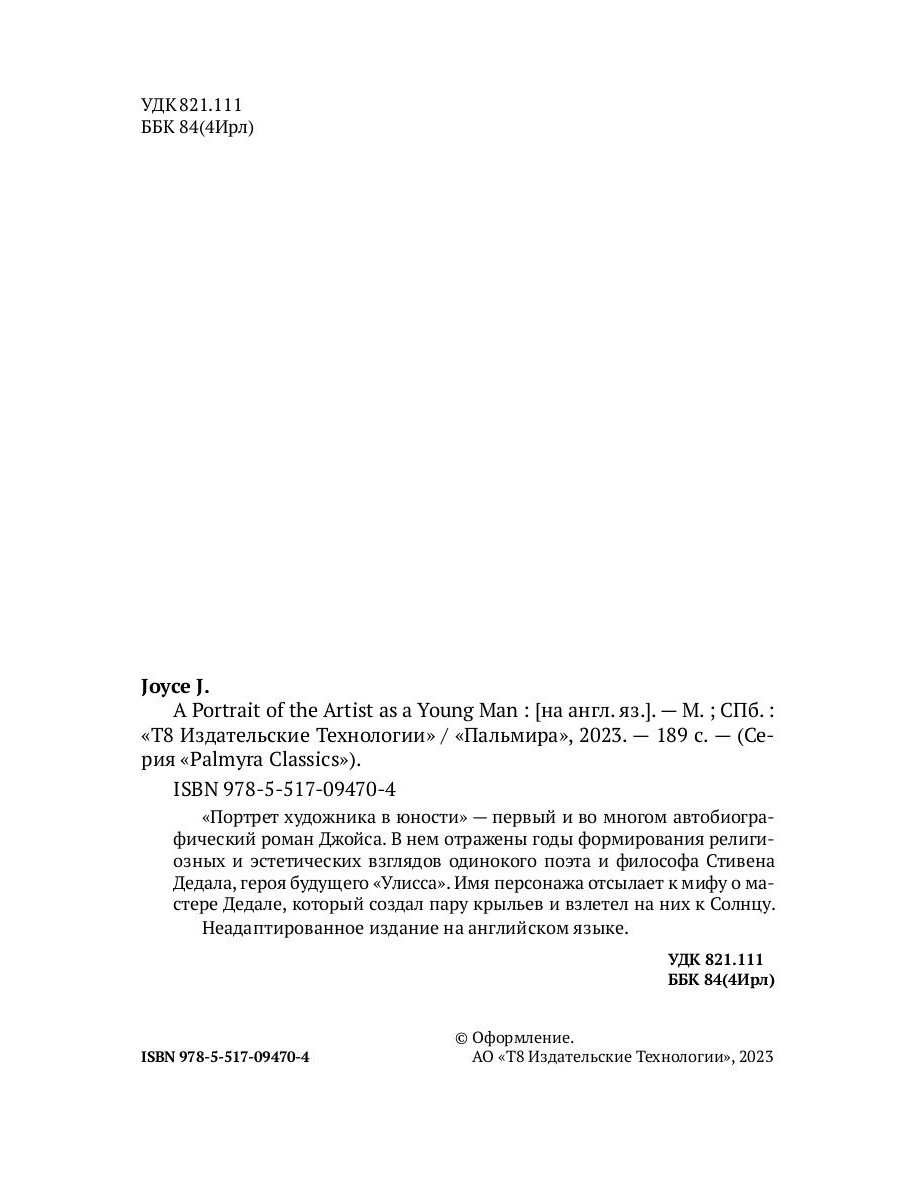 James Joyce, full name James Augustine Aloysius Joyce (1882-1941) - a famous Irish novelist. He is noted for his experimental use of language and exploration of new literary methods in such large works of fiction as Ulysses (1922) and Finnegans Wake (1939). A Portrait of the Artist as a Young Man is Joyce's first novel. Written in a modernist style, it traces the religious and intellectual awakening of young Stephen Dedalus, who comes to realize that before he can become an artist, he must rid himself of the overarching effects of the religion, politics and essential bigotry of his background. He questions and rebels against the Catholic and Irish conventions.| Издательство | Т8 RUGRAM |