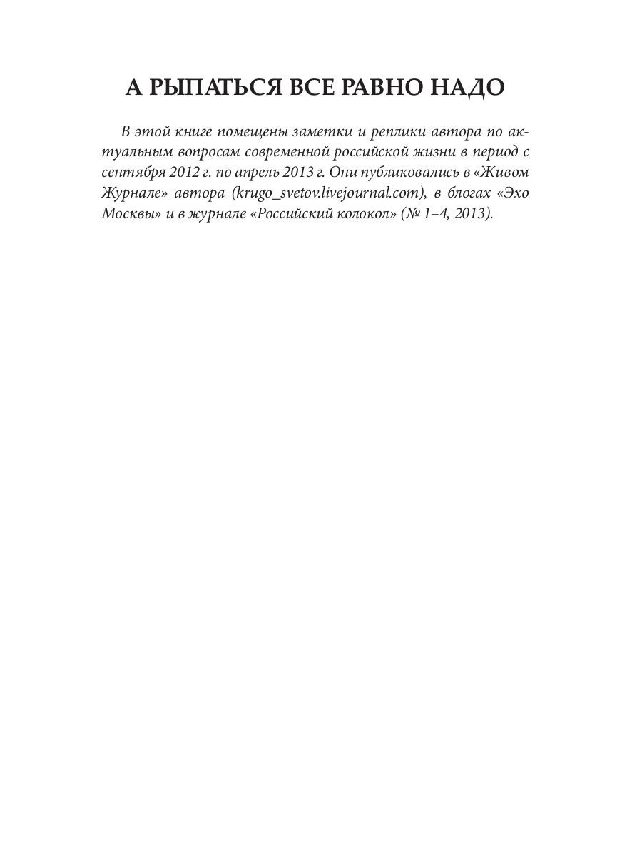 В 2014 году вышла моя книга «А рыпаться все равно надо», в которой были помещены публицистические заметки и реплики автора по актуальным вопросам российской жизни. Книга была неплохо встречена читателем, получила хорошие отзывы в прессе. В период с 2015 года по настоящее время появились новые актуальные заметки автора. Они публиковались в «Живом Журнале» автора, в блогах Интернационального Союза писателей, в колонке журнала «Аврора», в еженедельниках «Литературная Россия» и в НГ EX LIBRIS, в журнале «Российский колокол». Несмотря на то что после публикации этих заметок прошло уже некоторое время, они не потеряли своей актуальности. Поэтому я решил издать их новой книгой с названием «А рыпаться все равно надо - 2», обозначающим тематическую преемственность этой книги с предыдущим публицистическим сборником.| Издательство | Т8 RUGRAM |
