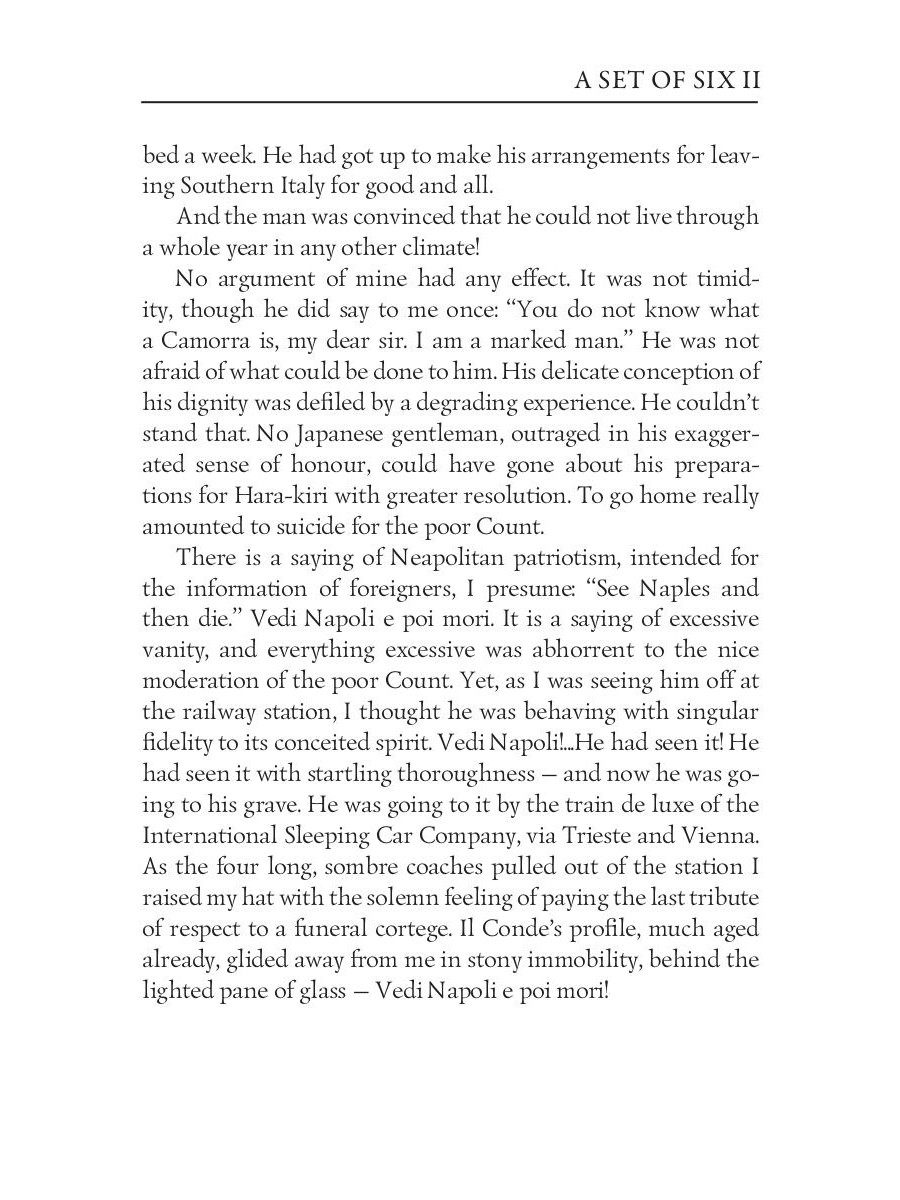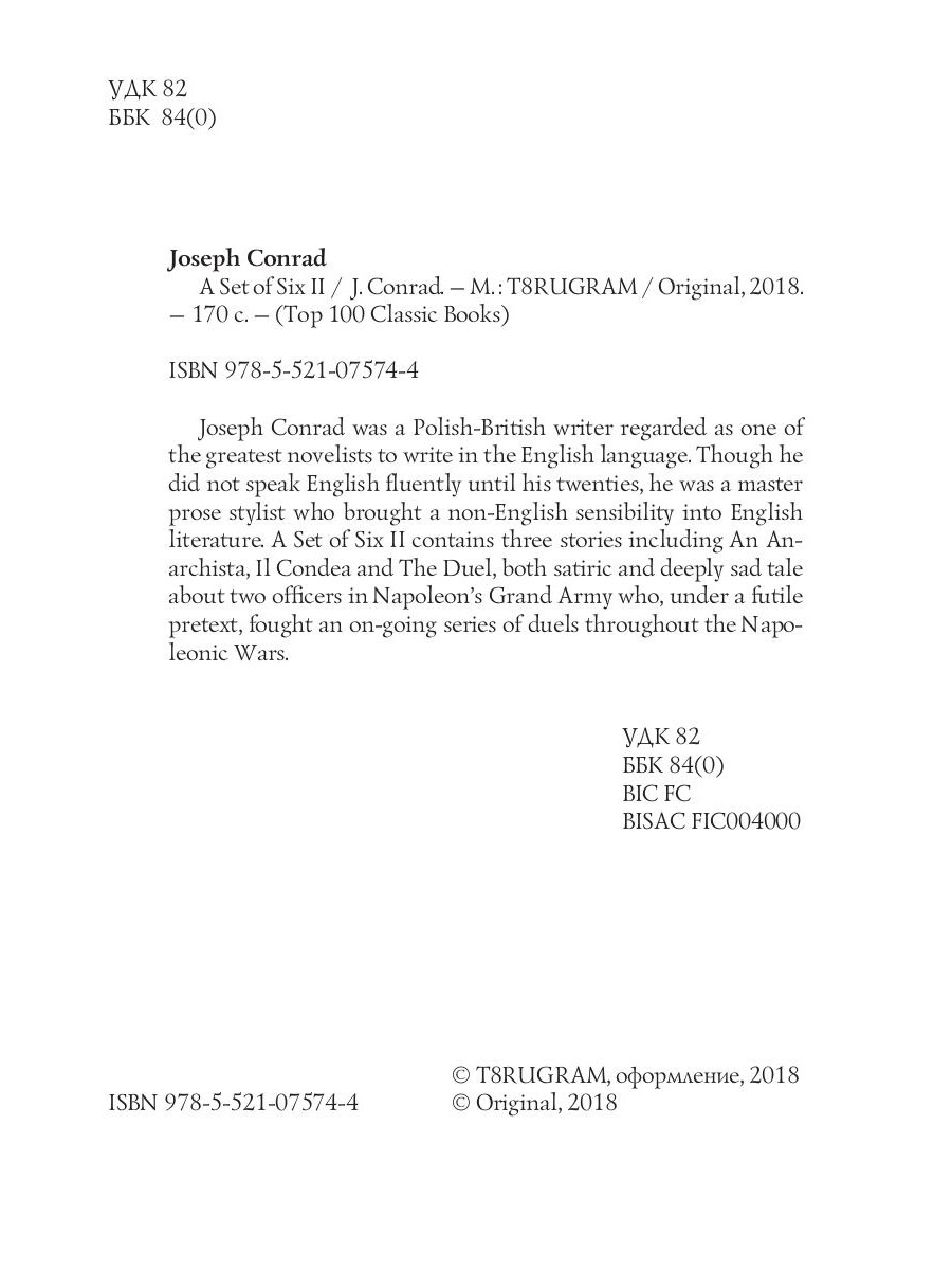 Joseph Conrad was a Polish-British writer regarded as one of the greatest novelists to write in the English language. Though he did not speak English fluently until his twenties, he was a master prose stylist who brought a non-English sensibility into English literature. A Set of Six II contains three stories including An Anarchista, Il Condea and The Duel, both satiric and deeply sad tale about two officers in Napoleon's Grand Army who, under a futile pretext, fought an on-going series of duels throughout the Napoleonic Wars.| Издательство | Т8 RUGRAM |