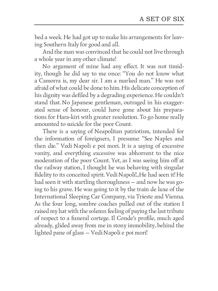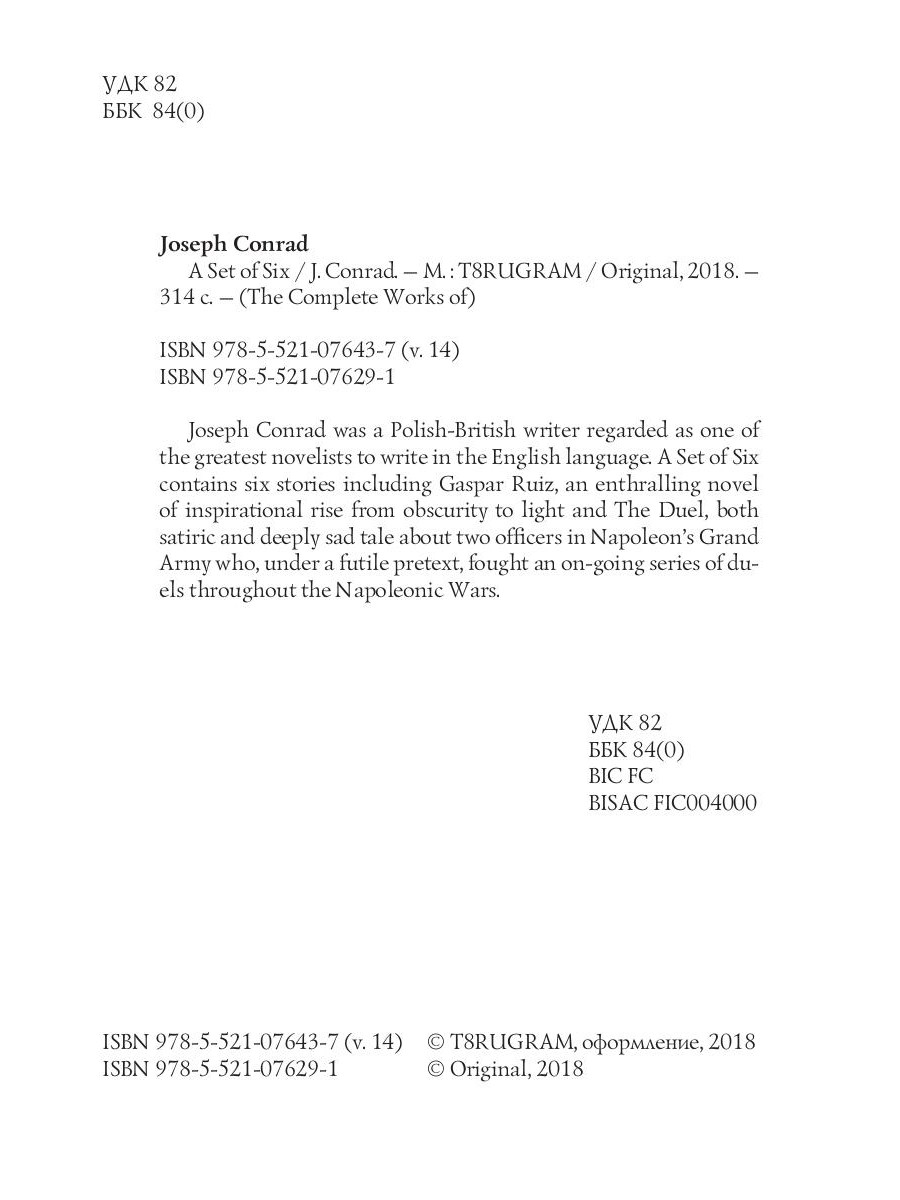 Joseph Conrad was a Polish-British writer regarded as one of the greatest novelists to write in the English language. A Set of Six contains six stories including Gas par Ruiz, an enthralling novel of inspirational rise from obscurity to light and The Duel, both satiric and deeply sad tale about two officers in Napoleon's Grand Army who, under a futile pretext, fought an on-going series of duels throughout the Napoleonic Wars.