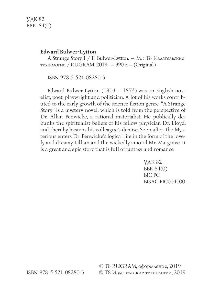 Edward Bulwer-Lytton (1803 - 1873) was an English novelist, poet, playwright and politician. A lot of his works contributed to the early growth of the science fiction genre. "A Strange Story" is a mystery novel, which is told from the perspective of Dr. Allan Fenwicke, a rational materialist. He publically debunks the spiritualist beliefs of his fellow physician Dr. Lloyd, and thereby hastens his colleague's demise. Soon after, the Mysterious enters Dr. Fenwicke's logical life in the form of the lovely and dreamy Lillian and the wickedly amoral Mr. Margrave. It is a great and epic story that is full of fantasy and romance.| Издательство | Т8 RUGRAM |