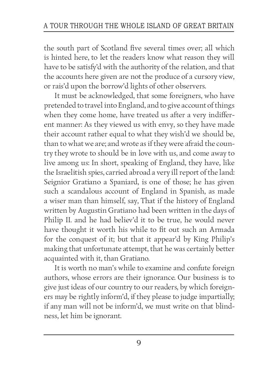 Daniel Defoe was an English trader, writer, pamphleteer and journalist. He is most famous for his novel "Robinson Crusoe", which is second only to the Bible in its number of translations. A Tour Through the Whole Island of Great Britain is an account of author's travels, first published in three volumes between 1724 and 1727. Daniel Defoe brings a lifetime's experience to the tradition of travel writing as a businessman, a soldier, an economic journalist and a spy. This book is not only a beautifully written guide to Britain just before the industrial revolution; it is his deeply imaginative response to a brave new economic world.