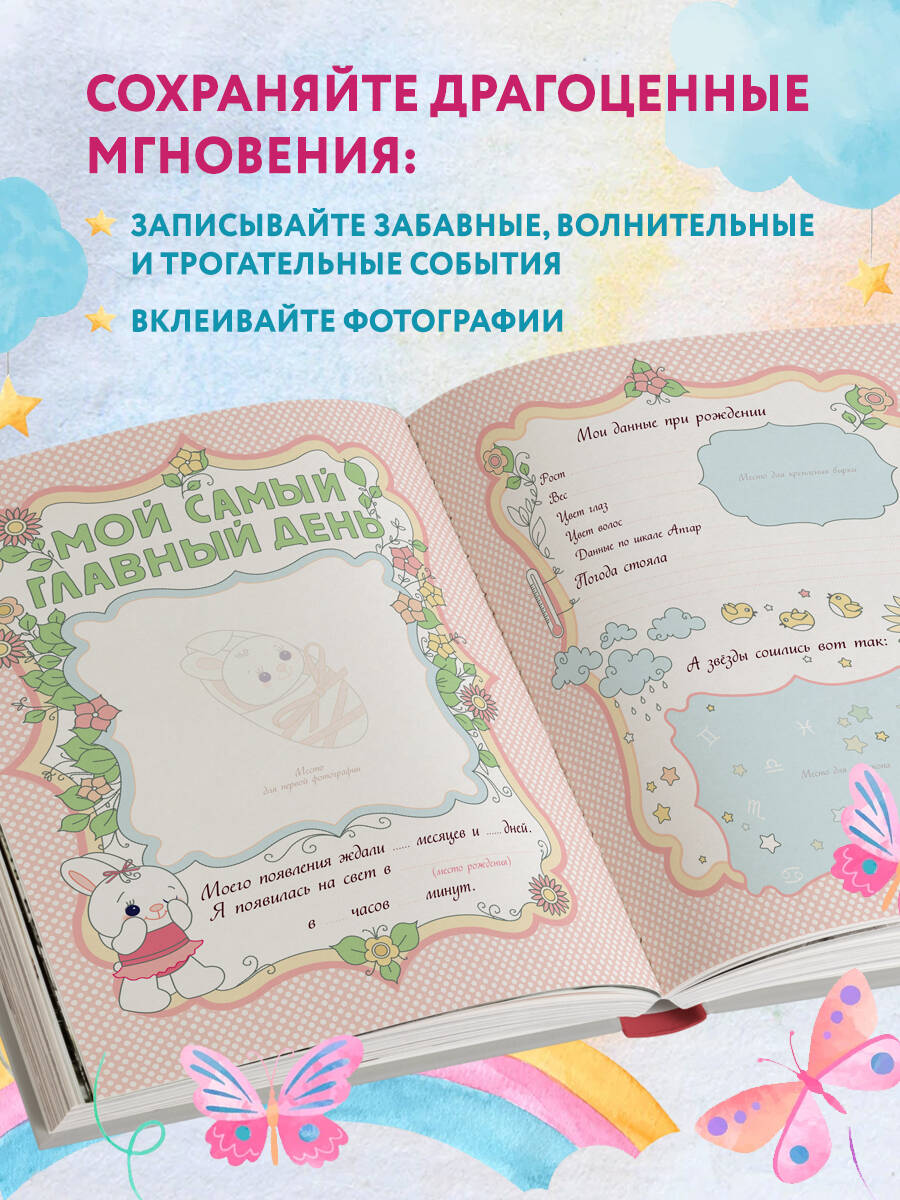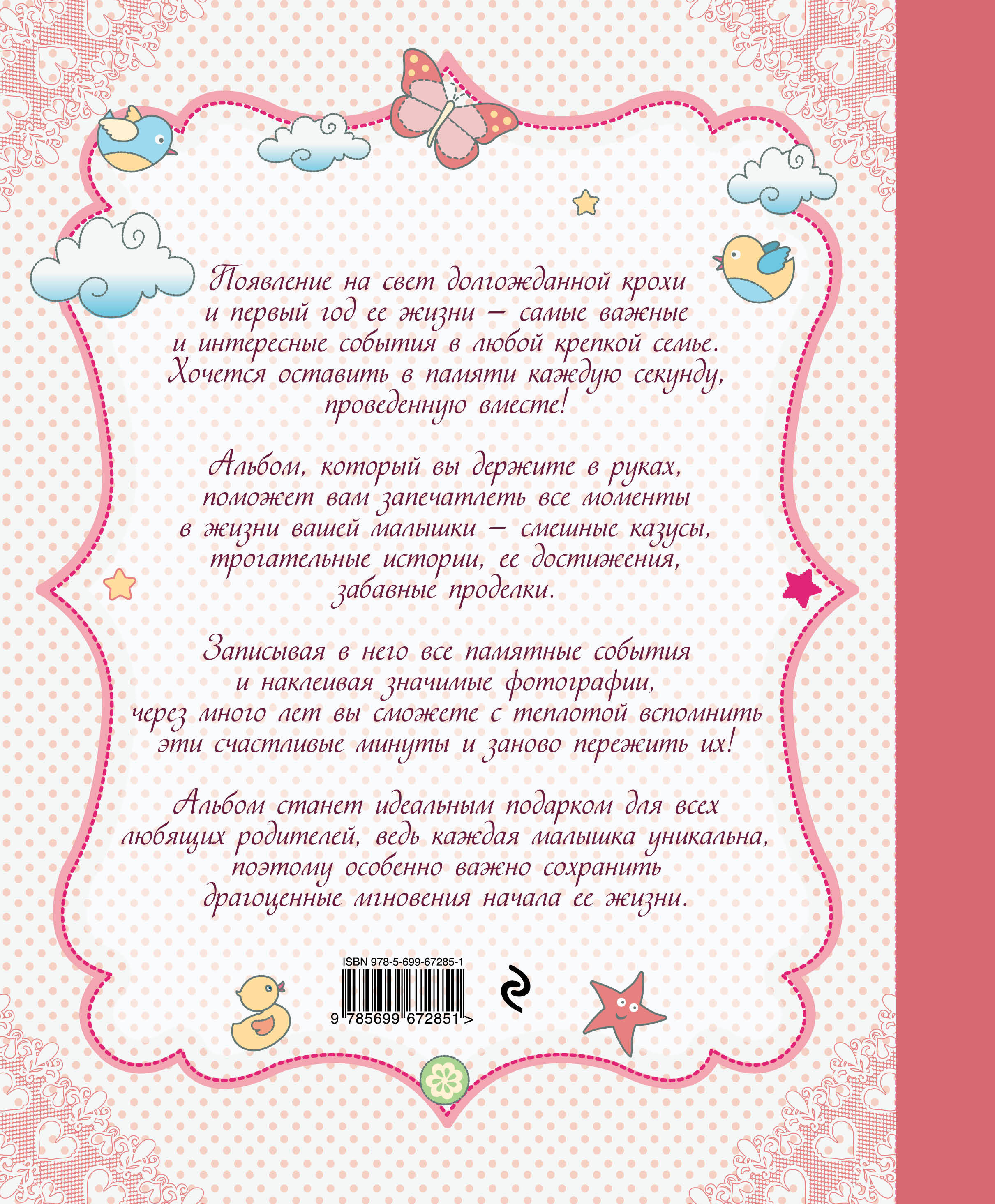 О чем эта книга Этот красочный альбом предназначен для записи всех важных событий первого года жизни вашего малыша. Кроме того, сюда вы сможете наклеивать забавные фото вашего крохи. Для кого эта книга Для всех любящих родителей, мечтающих сохранить в памяти как можно больше трогательных моментов, связанных с их малышом. Особенности книги Уникальный авторский дизайн. Оформление альбома выполнено для родителей девочки/мальчика.