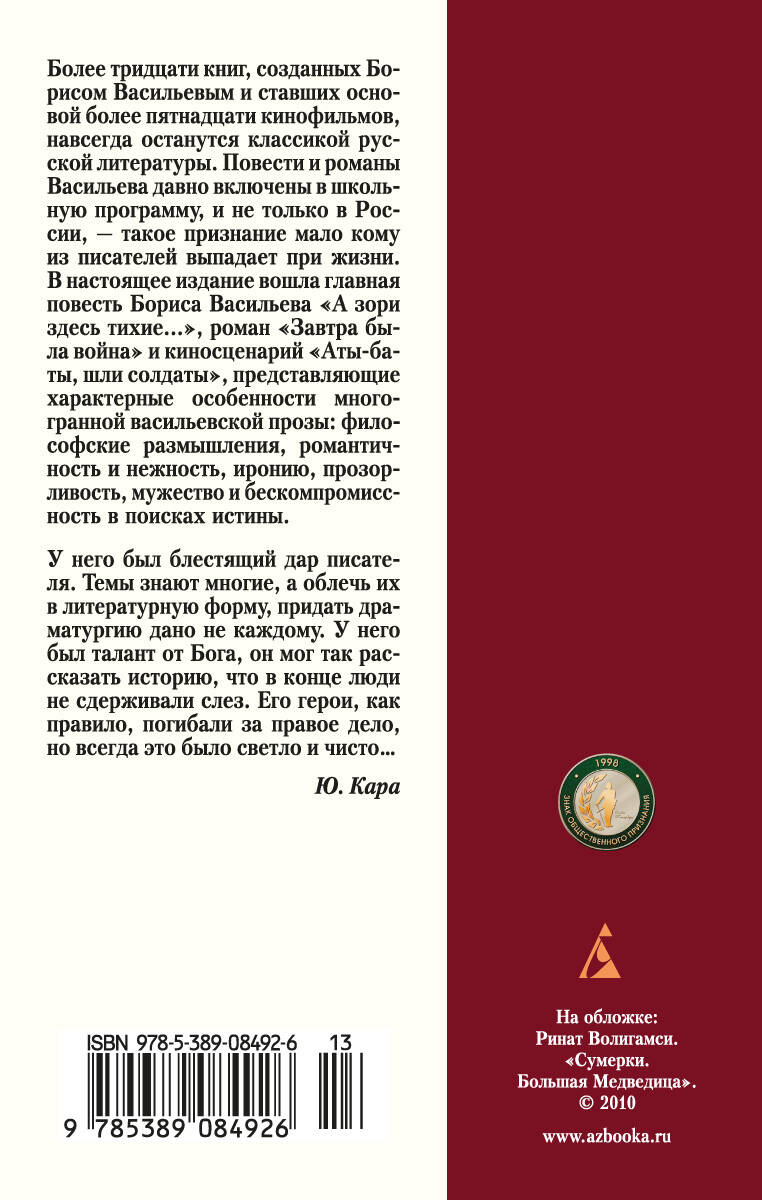 Более тридцати книг, созданных Борисом Васильевым и ставших основой более пятнадцати кинофильмов, навсегда останутся классикой русской литературы. Повести и романы Васильева давно включены в школьную программу, и не только в России, - такое признание мало кому из писателей выпадает при жизни. В настоящее издание вошла главная повесть Бориса Васильева "А зори здесь тихие...", роман "Завтра была война" и киносценарий "Аты-баты, шли солдаты", представляющие характерные особенности многогранной васильевской прозы: философские размышления, романтичность и нежность, иронию, прозорливость, мужество и бескомпромиссность в поисках истины.| Издательство | Азбука-Аттикус Издат.группа ООО |