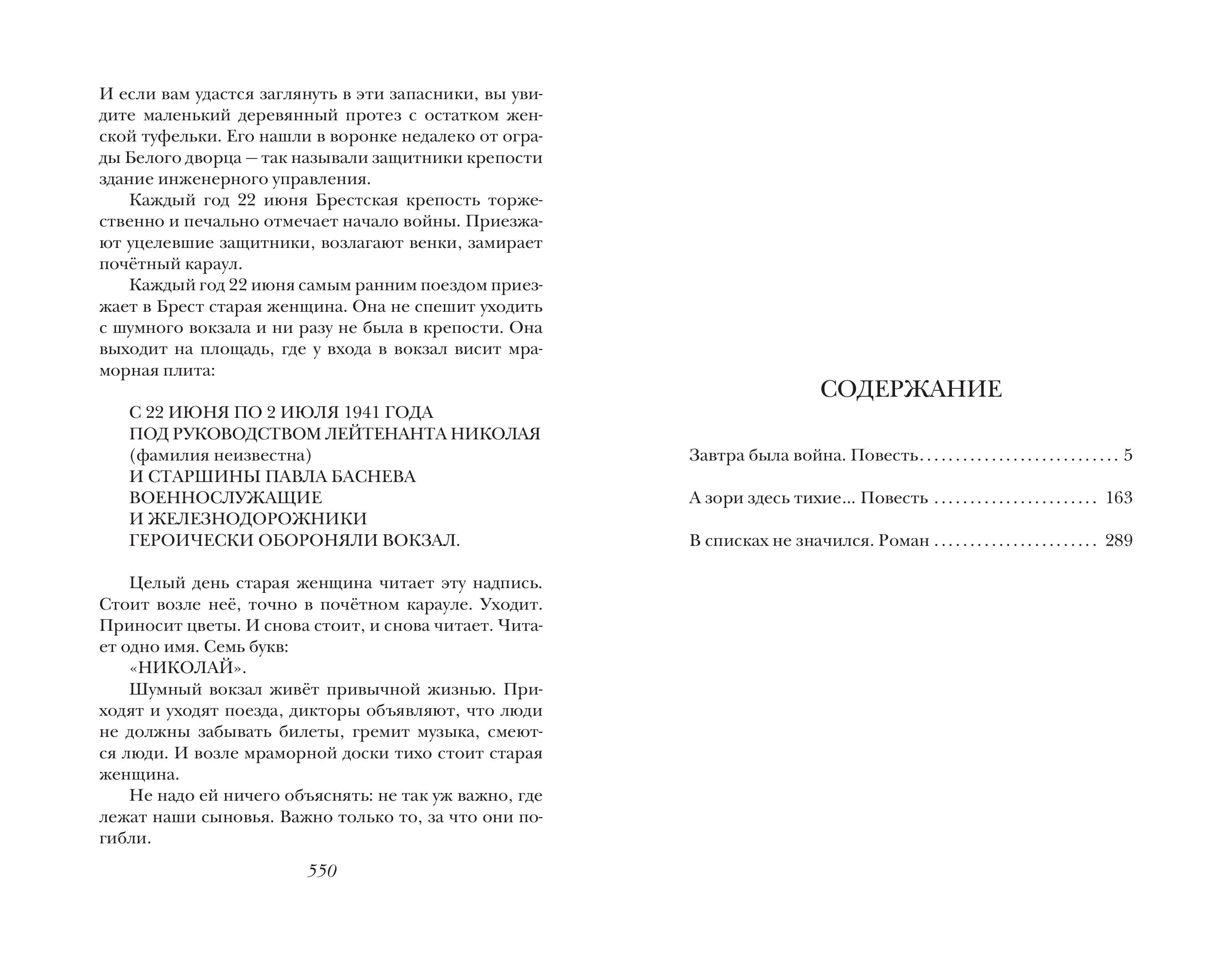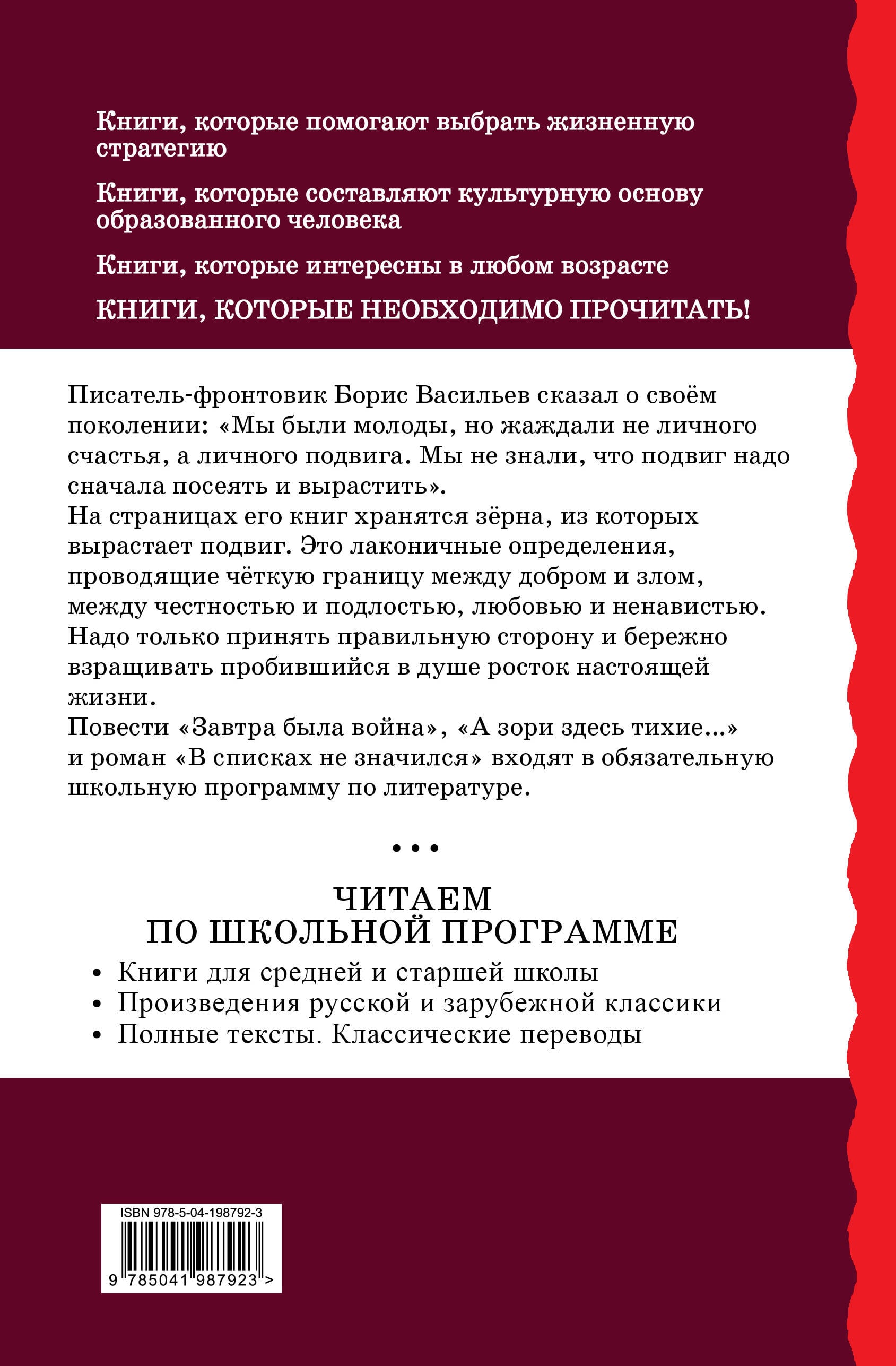 Известный советский писатель и сценарист Борис Львович Васильев однажды сказал: «Война беспощадна - она остается в человеке на всю жизнь». Он ушёл на фронт 17-летним юношей, попадал в окружение, воевал на переднем крае, был тяжело ранен. Но, зная всю боль и весь ужас войны, писатель понимал, что главные сражения идут в умах и душах людей. Видимо, поэтому так остро и пронзительно отзываются в сердце строки его произведений. Герои Бориса Васильева, каждый по-своему, ведут личный бой - за право называться человеком. В книгу вошли повести «Завтра была война», «А зори здесь тихие…» и роман «В списках не значился». Книги серии «Читаем по школьной программе» адресованы учащимся средней и старшей школы. Все произведения русской и зарубежной классики, которые необходимо изучить согласно обновлённому государственному образовательному стандарту, найдутся среди толстых красных корешков! Серия «Читаем по школьной программе» - это продолжение книжных серий «Читаем до школы» и «Книги для внеклассного чтения». Красные корешки - гарантия отличных оценок по литературе! Издание в твёрдом переплёте. Произведения входят в школьную программу по литературе для старших классов.| Издательство | ООО "Издательство "Эксмо" |