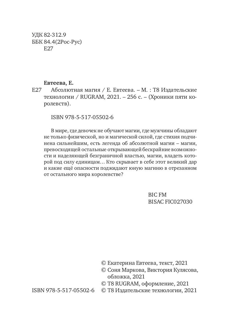 В мире, где девочек не обучают магии, где мужчины обладают не только физической, но и магической силой, где стихия подчинена сильнейшим, есть легенда об абсолютной магии - магии, превосходящей остальные открывающей бескрайние возможности и наделяющей безграничной властью, магии, владеть которой под силу единицам… Кто скрывает в себе этот великий дар и какие ещё опасности поджидают юную магиню в отрезанном от остального мира королевстве?| Издательство | Т8 RUGRAM |