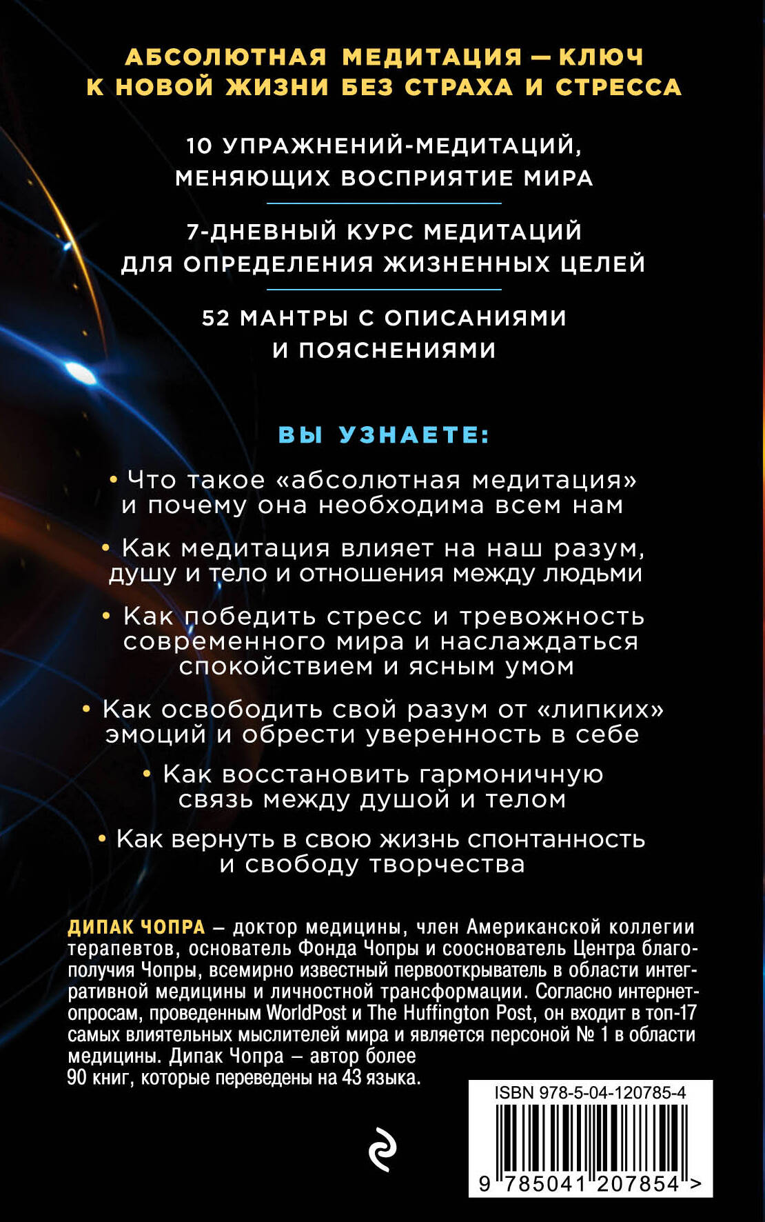 Медитация спасет современный мир и нас в нем, убежден Дипак Чопра, автор мировых бестселлеров, специалист по интегративной медицине и самопознанию. Эта книга - плод его многолетних исследований и подробнейшее описание феномена медитации и ее положительного воздействия на наше физическое, ментальное и эмоциональное состояние, а также отношения с другими людьми и миром. В ней Дипак Чопра не только делится новейшими сведениями и научными данными о медитации, но и рассказывает, как сделать ее привычной повседневной практикой и сразу же ощутить ее целительное воздействие. Вы узнаете: • Что такое «абсолютная медитация» и почему она необходима всем нам. • Как медитация влияет на наш разум, душу и тело и отношения между людьми. • Как победить стресс и тревожность современного мира и наслаждаться спокойствием и ясным умом. • Как освободить свой разум от «липких» эмоций и обрести уверенность в себе. • Как восстановить гармоничную связь между душой и телом. • Как вернуть в свою жизнь спонтанность - и свободу творчества. Дипак Чопра - доктор медицины, член Американской коллегии терапевтов, основатель Фонда Чопры и сооснователь Центра благополучия Чопры - всемирно известный первооткрыватель в области интегративной медицины и личностной трансформации. Согласно интернет-опросам, проведенным WorldPost и The Huffington Post, он входит в Топ-17 самых влиятельных мыслителей мира и является персоной № 1 в области медицины. Дипак Чопра - автор более 90 книг, которые переведены на 43 языка мира| Издательство | ООО "Издательство "Эксмо" |