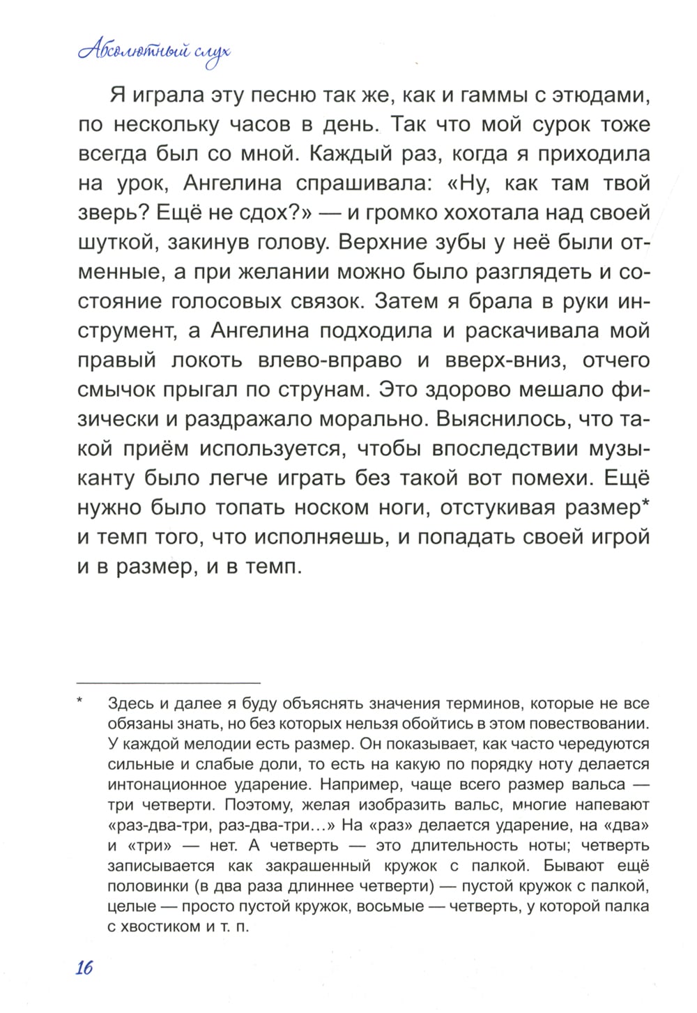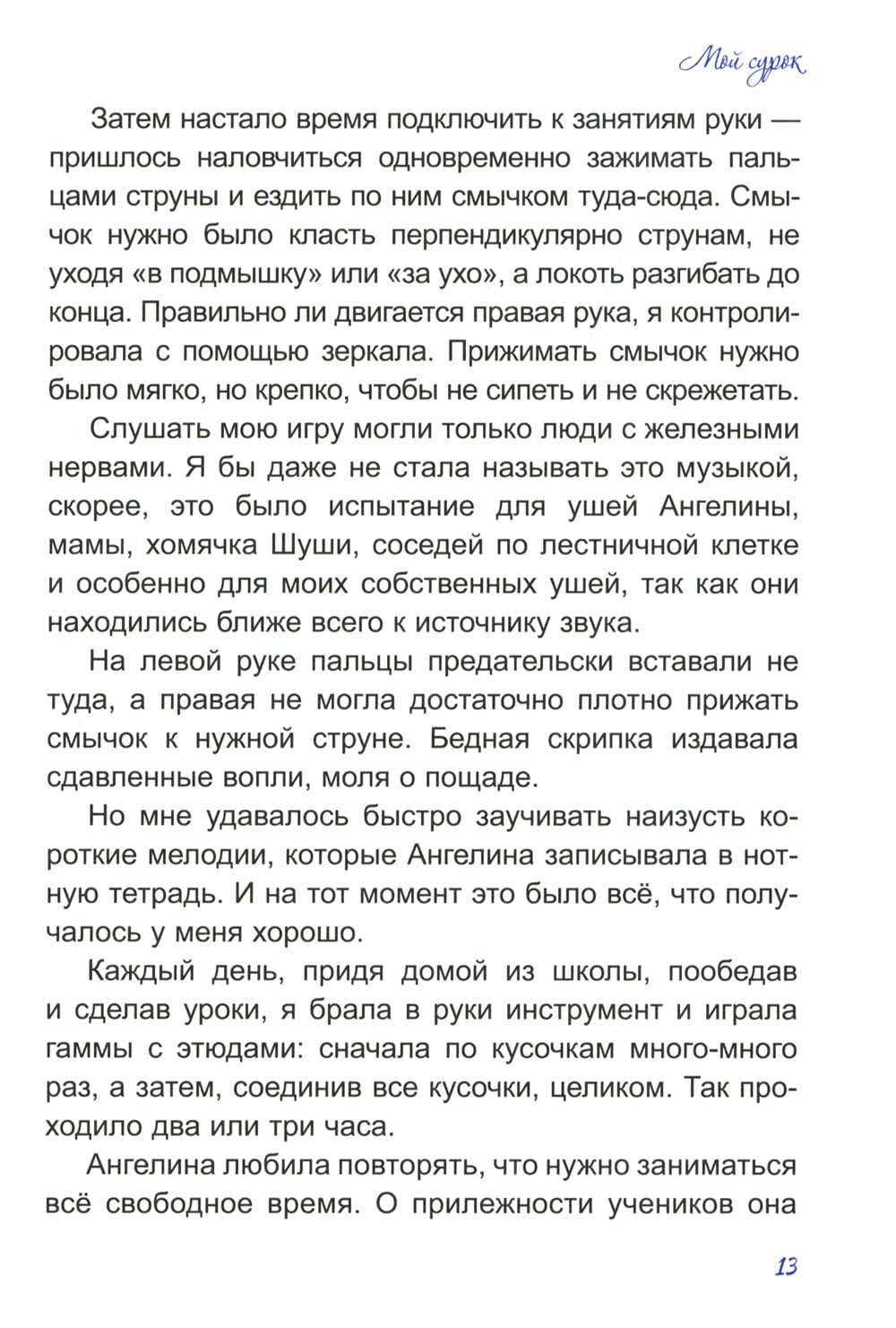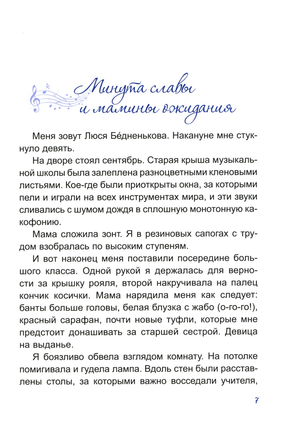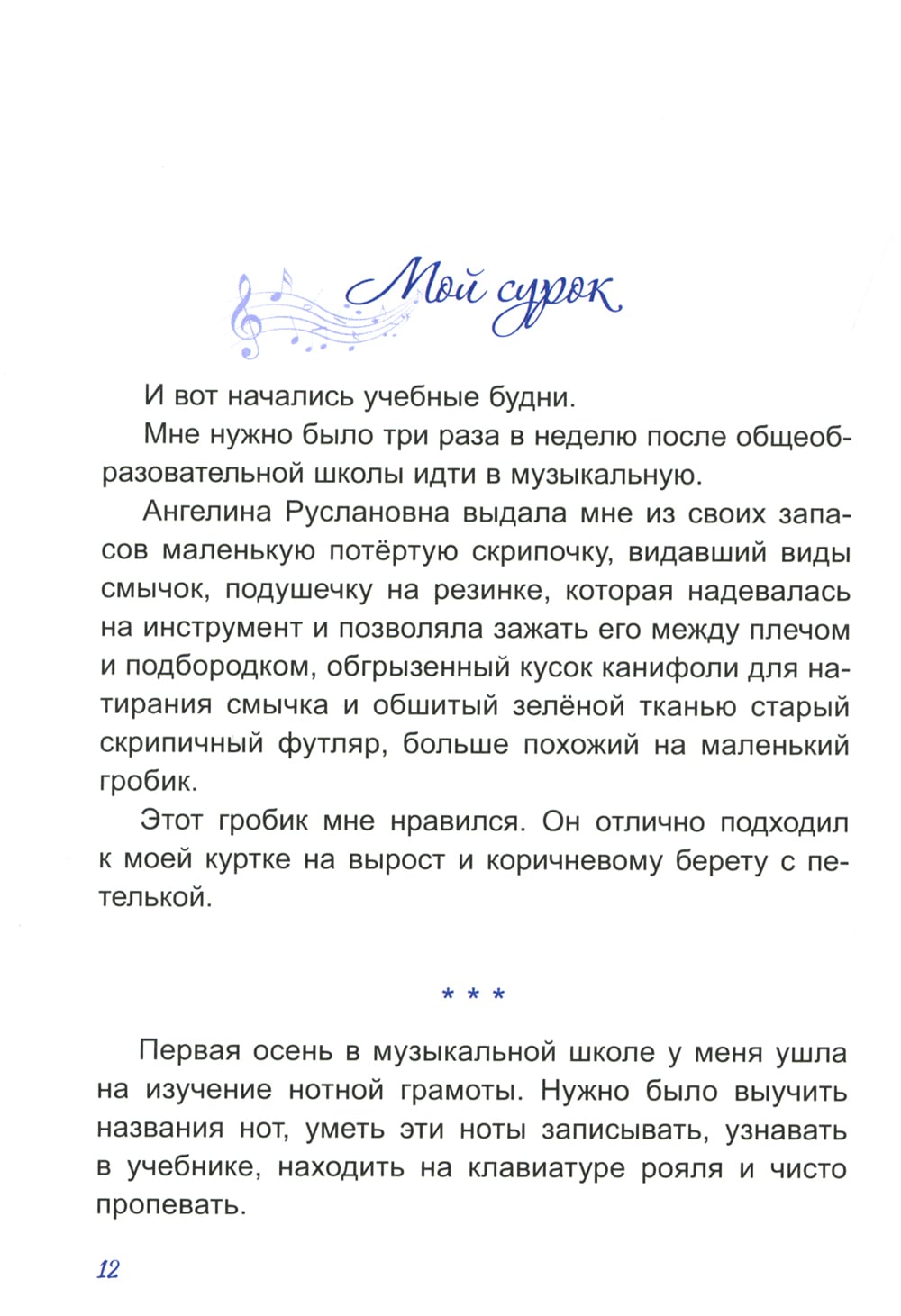 Часто природный дар заставляет человека посвятить жизнь не тому, к чему склонна душа. «У ребёнка абсолютный слух», - услышала мама Люси «приговор» отборочной комиссии в музыкальной школе. И Люся стала скрипачкой в оркестре. Казалось, благодаря таланту, и дальнейшая судьба её расписана взрослыми «по нотам», но на пути к профессии встречается множество проблем. Справиться с ними девочке помогают упорство, трудолюбие и, конечно, чувство юмора, выручающее в трудную минуту. Эта повесть поможет многим родителям не сделать детей заложниками таланта. А детям - понять, что путей для самореализации много, важно найти собственный. Книга адресована детям от 11 лет.| Издательство | Антология |