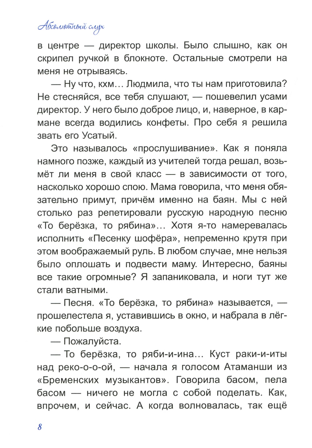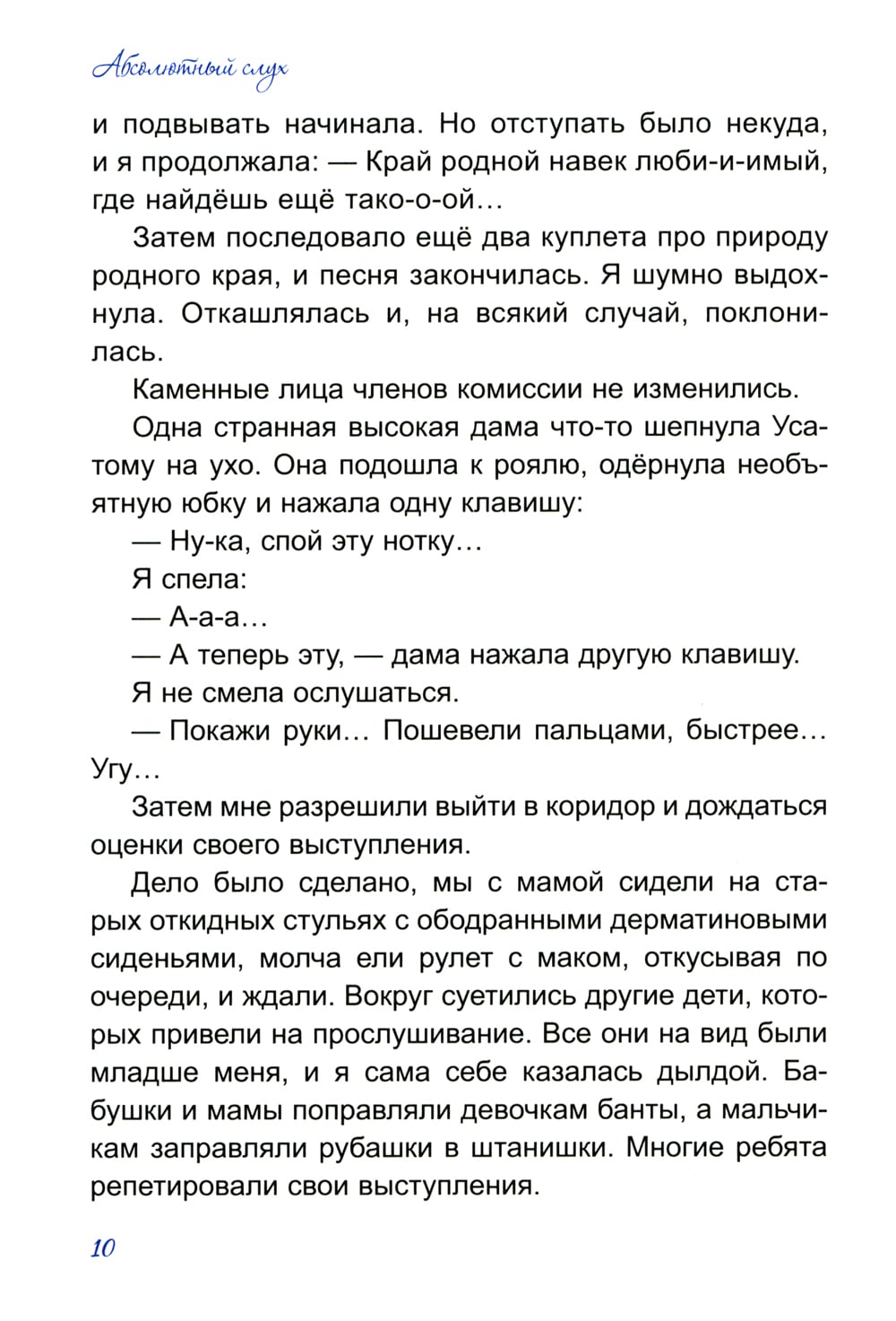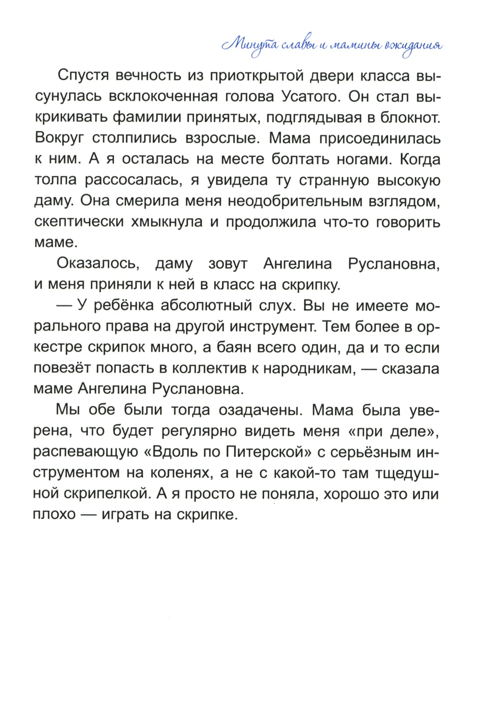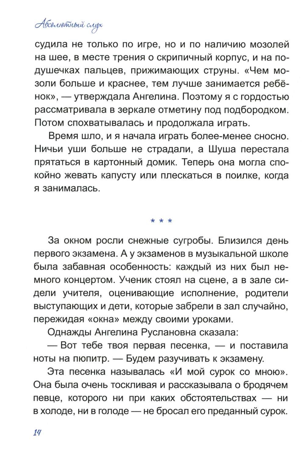 Часто природный дар заставляет человека посвятить жизнь не тому, к чему склонна душа. «У ребёнка абсолютный слух», - услышала мама Люси «приговор» отборочной комиссии в музыкальной школе. И Люся стала скрипачкой в оркестре. Казалось, благодаря таланту, и дальнейшая судьба её расписана взрослыми «по нотам», но на пути к профессии встречается множество проблем. Справиться с ними девочке помогают упорство, трудолюбие и, конечно, чувство юмора, выручающее в трудную минуту. Эта повесть поможет многим родителям не сделать детей заложниками таланта. А детям - понять, что путей для самореализации много, важно найти собственный. Книга адресована детям от 11 лет.| Издательство | Антология |