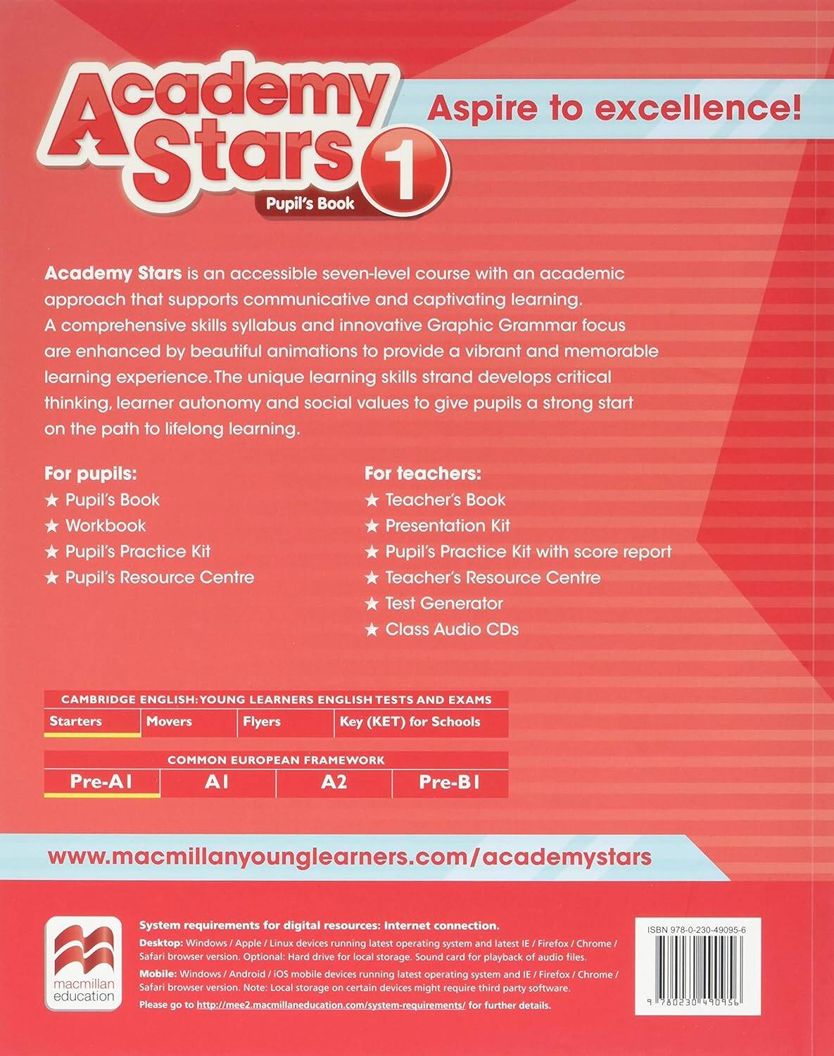 Academy Stars 1 Level 1 Pupil's Book with online resources Книга для учащегося содержит вводный курс, 10 основных тематических разделов, тексты для дополнительного чтения с видеосюжетами, иллюстрированный словарь, специальные задания для подготовки к международным экзаменам Cambridge English: Young Learners Pre-A1 Starters. Каждый раздел рассчитан примерно на 10 академических часов и охватывает материал по развитию умений во всех видах речевой деятельности: чтении, письме, аудировании и говорении, а также по формированию универсальных учебных действий. Книга для учащегося выпускается с кодом доступа к интернет-ресурсу для учащегося Pupil's Resource Centre. Интернет-ресурс для учащегося содержит: • аудиофайлы к текстам и упражнениям учебника; • видеопрезентации грамматических правил; • видеосюжеты к заданиям по говорению; • видеосюжеты к текстам по дополнительному чтению; • Pupil's Practice Kit - интерактивные упражнения для дополнительной языковой практики на уроке и дома с автоматической проверкой ответов и электронным дневником достижений.| Издательство | Macmillan Education |