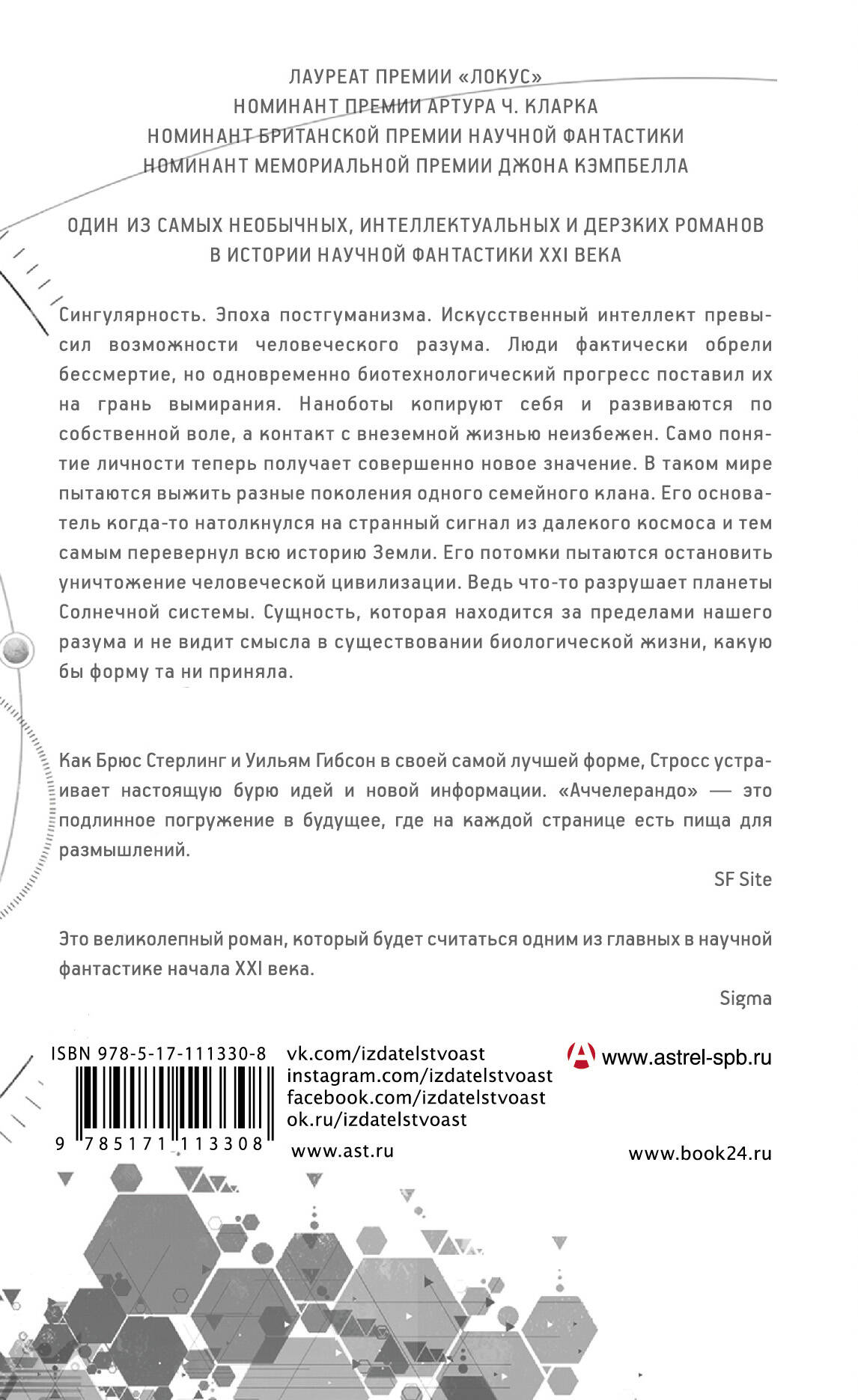 Сингулярность. Эпоха постгуманизма. Искусственный интеллект превысил возможности человеческого разума. Люди фактически обрели бессмертие, но одновременно биотехнологический прогресс поставил их на грань вымирания. Наноботы копируют себя и развиваются по собственной воле, а контакт с внеземной жизнью неизбежен. Само понятие личности теперь получает совершенно новое значение. В таком мире пытаются выжить разные поколения одного семейного клана. Его основатель когда-то натолкнулся на странный сигнал из далекого космоса и тем самым перевернул всю историю Земли. Его потомки пытаются остановить уничтожение человеческой цивилизации. Ведь что-то разрушает планеты Солнечной системы. Сущность, которая находится за пределами нашего разума и не видит смысла в существовании биологической жизни, какую бы форму та ни приняла.| Издательство | Издательство "АСТ" |