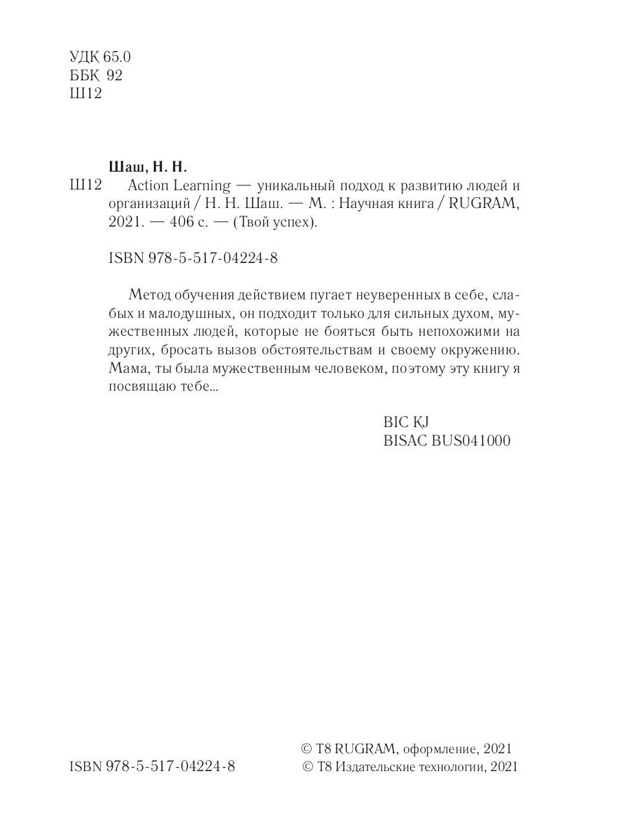 Метод обучения действием пугает неуверенных в себе, слабых и малодушных, он подходит только для сильных духом, мужественных людей, которые не бояться быть непохожими на других, бросать вызов обстоятельствам и своему окружению. Мама, ты была мужественным человеком, поэтому эту книгу я посвящаю тебе …| Издательство | Т8 RUGRAM |