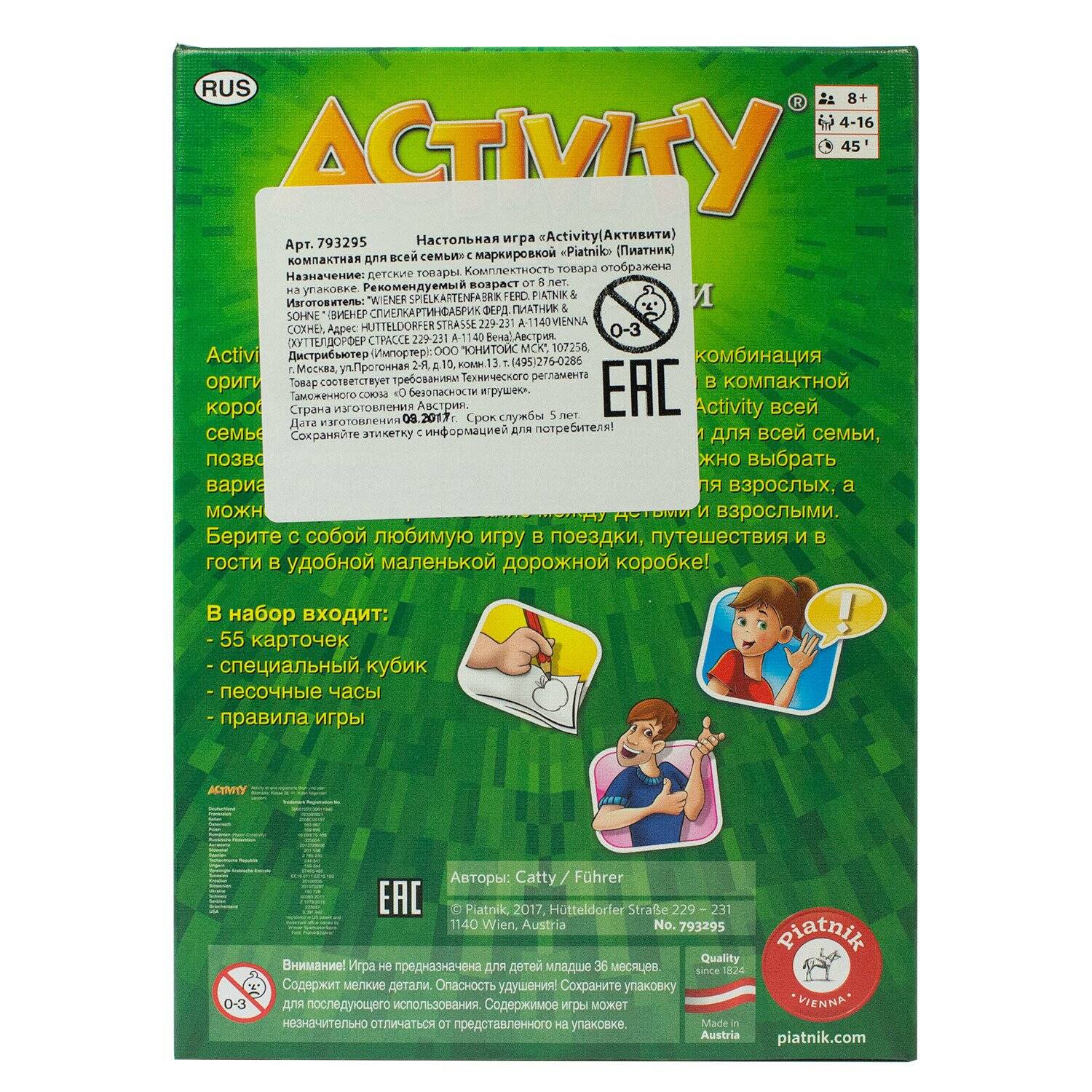Настольная игра Activity Travel 793295 для всей семьи в компактной упаковке прекрасно подойдет для длительных путешествий, походов на природу или в гости. Новая версия этой настолки играется по классическим правилам. Слова с карточек необходимо объяснить своим союзникам тремя возможными способами: словами, рисунком или пантомимой. На каждой карте указано шесть тем, которые необходимо будет угадать. (Если одна из тем выделена красным, разыгрывается "Открытый раунд", подробно описанный в правилах игры). Песочные часы рассчитаны на одну минуту: именно столько длится один ход команды. А для того, чтобы определить каким способом вести объяснения, бросается кубик. Грань с буквой Z означает рисование, E - объяснение словами, D - пантомима. Игра упакована в небольшую коробку, которую будет удобно брать с собой в путешествие, на природу, на дачу или в любое другое место. Победные очки начисляются без игрового поля, благодаря чему участникам не нужно искать стол. Набор карточек не пересекается с классической Activity, поэтому с небольшой походной версии можно начать знакомство с этой популярной игрой. В игре могут принимать участие от 4 до 16 человек в возрасте от 8 лет. Сначала необходимо разделиться на 2, 3 или 4 команды, в каждой из которых должно быть не менее двух людей. Все карты перемешиваются и кладутся рубашкой вверх. Каждая из команд выбирает ведущего на первый ход (в следующем ходу его заменяет другой участник этой команды). Игрок первой команды смотрит верхнюю карту колоды так, чтобы никто больше ее не видел. Затем бросается кубик и по выпавшему значению выбирается способ объяснения: словами, рисунком или пантомимой. После чего переворачиваются песочные часы и начинается игра. ... дальше " Если за минуту участникам команды удается угадать слово, они оставляют карточку у себя. Перед тем, как перевернуть песочные часы, каждая из команд решает задавать вопросы под четными или нечетными цифрами. Побеждает команда, набравшее большее количество карточек за все время игры. В среднем одна партия игры занимает от 45 минут. В коробке вы найдете: 5 карточек на 330 слов, песочные часы для отсчета ходов, кубик для определения задания, правила игры.| Издательство | ЮНИТОЙС МСК ООО |