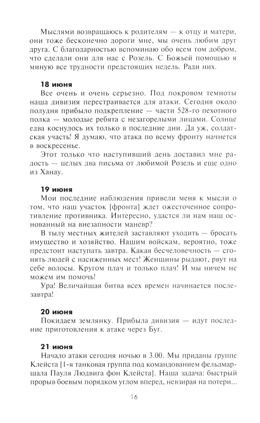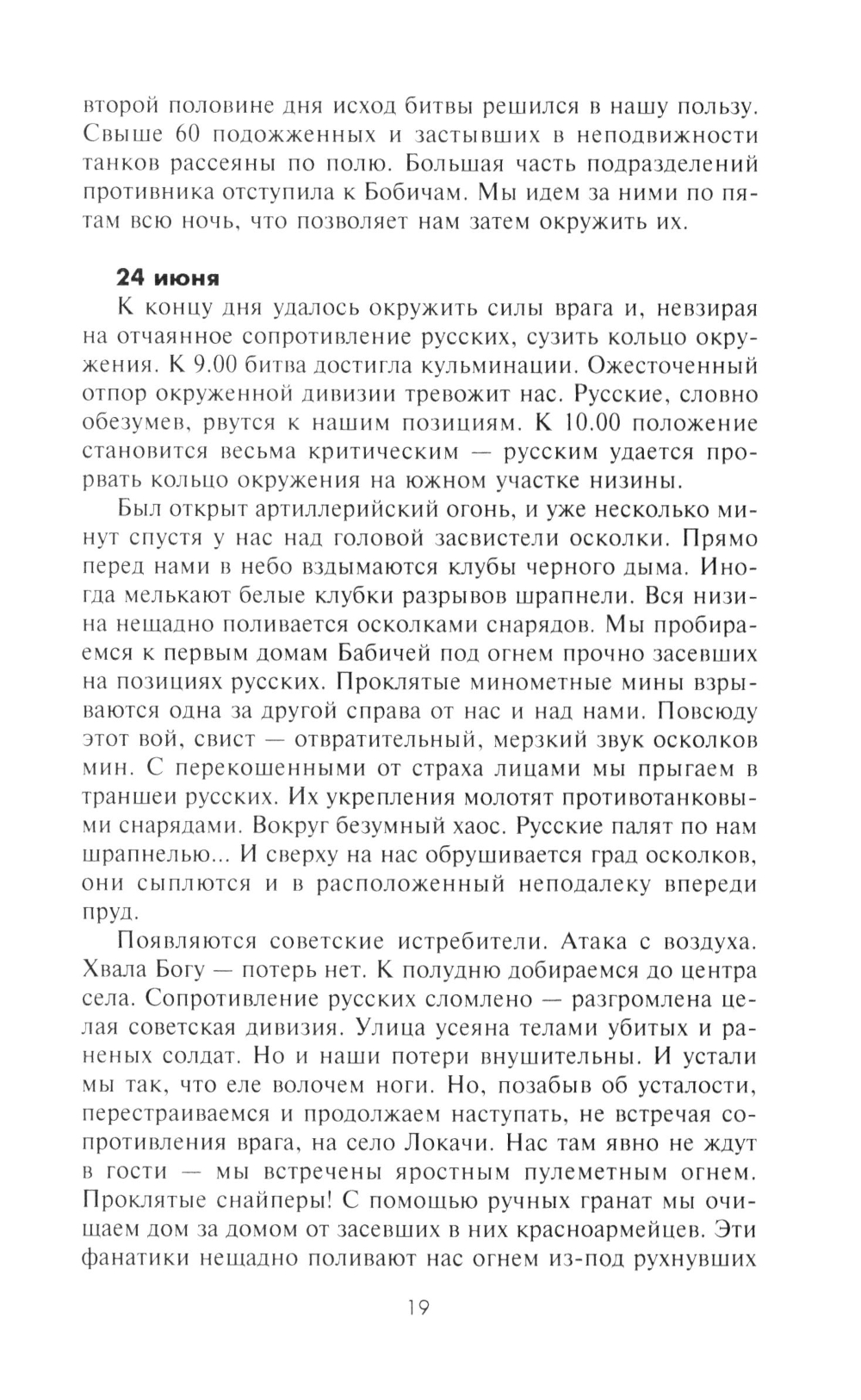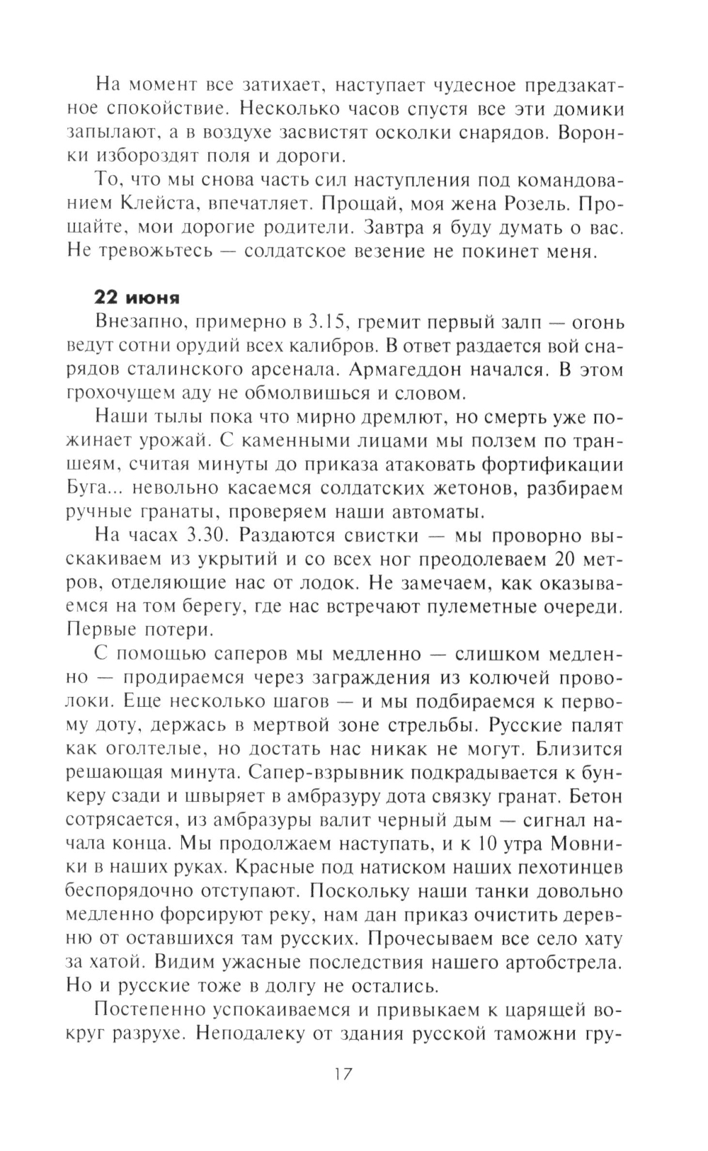 Ефрейтор, а позднее фельдфебель Ганс Рот начал вести свой дневник весной 1941 г., когда 299-я дивизия, в которой он воевал, в составе 6-й армии, готовилась к нападению на Советский Союз. В соответствии с планом операции «Барбаросса» дивизия в ходе упорных боев продвигалась южнее Припятских болот. В конце того же года подразделение Рота участвовало в замыкании кольца окружения вокруг Киева, а впоследствии в ожесточенных боях под Сталинградом, в боях за Харьков, Воронеж и Орел. Почти ежедневно автор без прикрас описывал все, что видел своими глазами: кровопролитные бои и жестокую расправу над населением на оккупированных территориях, суровый солдатский быт и мечты о возвращении к мирной жизни. В 1944 г. фельдфебель Ганс Рот пропал без вести в Витебском котле, но сохранились три дневника с описанием боевых действий, в которых он принимал участие. Лишь много лет спустя их обнаружили внуки Рота и осуществили издание записок своего деда.| Издательство | Центрполиграф |
