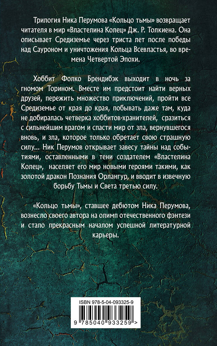 Трилогия Ника Перумова «Кольцо тьмы» возвращает читателя в мир «Властелина Колец» Дж. Р. Толкина. Она описывает Средиземье через триста лет после победы над Сауроном и уничтожения Кольца Всевластья, во времена Четвертой Эпохи. Хоббит Фолко Брендибэк выходит в ночь за гномом Торином. Вместе им предстоит найти верных друзей, пережить множество приключений, пройти все Средиземье от края до края, побывать даже там, куда не добиралась четверка хоббитов-хранителей, сразиться с сильнейшим врагом и спасти мир от зла, вернувшегося вновь, и зла, которое только обретает свою страшную силу... Ник Перумов открывает завесу тайны над событиями, оставленными в тени создателем «Властелина Колец», населяет его мир новыми героями, такими, как золотой дракон Познания Орлангур, и вводит в извечную борьбу Тьмы и Света третью силу. «Кольцо Тьмы», ставшее дебютом Ника Перумова, вознесло своего автора на Олимп отечественного фэнтези и стало прекрасным началом успешной литературной карьеры.