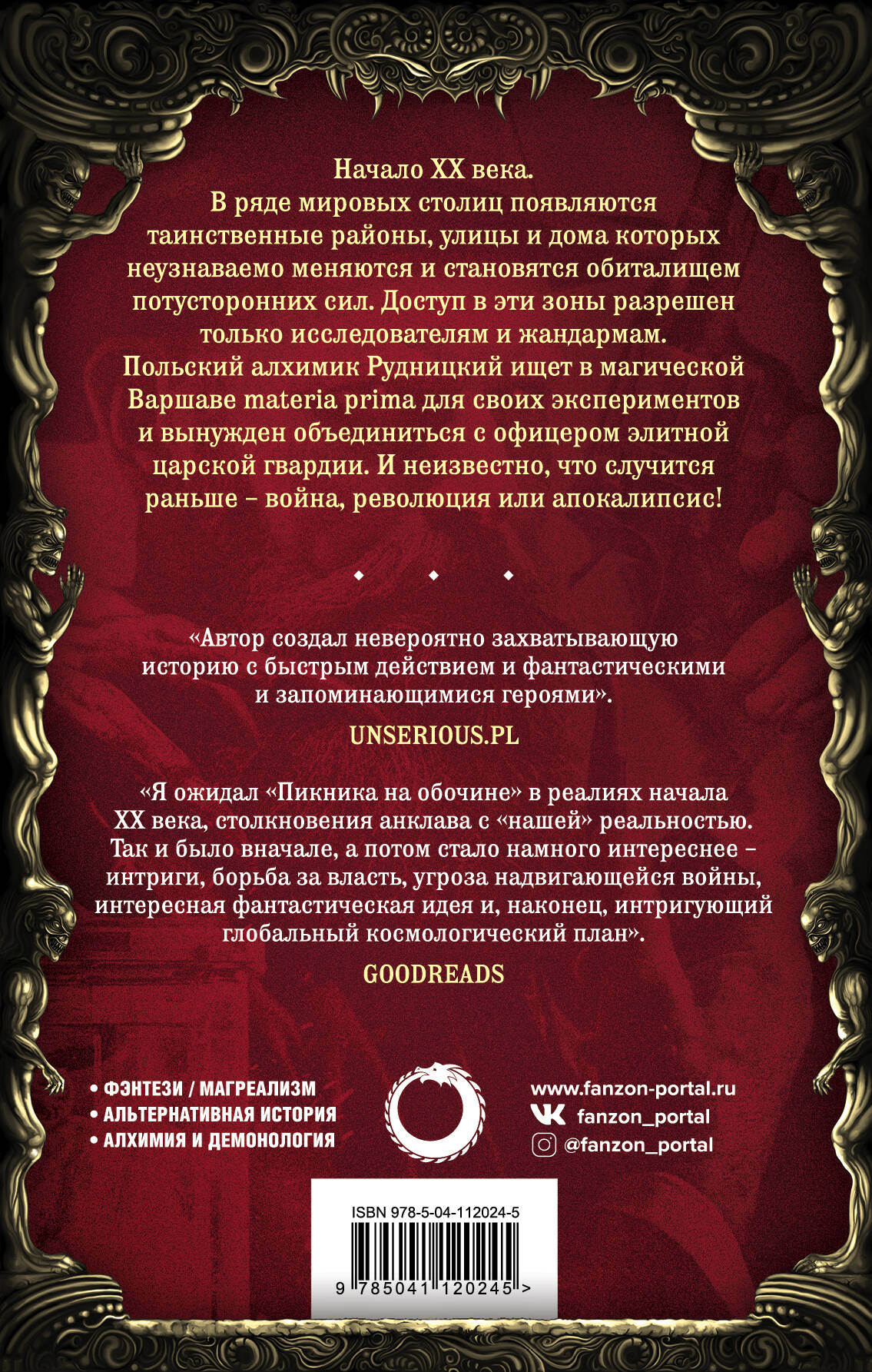 Начало XX века. В ряде мировых столиц появляются таинственные районы, улицы и дома которых неузнаваемо меняются и становятся обиталищем потусторонних сил. Доступ в эти зоны разрешен только исследователям и жандармам. Польский алхимик Рудницкий ищет в магической Варшаве materia prima для своих экспериментов и вынужден объединиться с офицером элитной царской гвардии. И неизвестно, что случится раньше - война, революция или апокалипсис! «Автор создал невероятно захватывающую историю с быстрым действием и фантастическими и запоминающимися героями». - unserious.pl «Я ожидал "Пикника на обочине" в реалиях начала ХХ века, столкновения анклава с "нашей" реальностью. Так и было вначале, а потом стало намного интереснее - интриги, борьба за власть, угроза надвигающейся войны, интересная фантастическая идея и, наконец, интригующий глобальный космологический план». - Goodreads