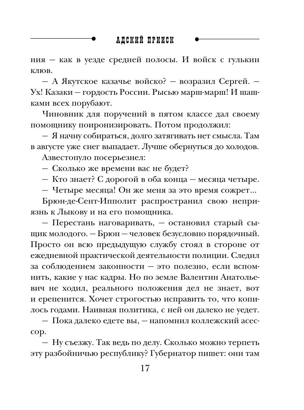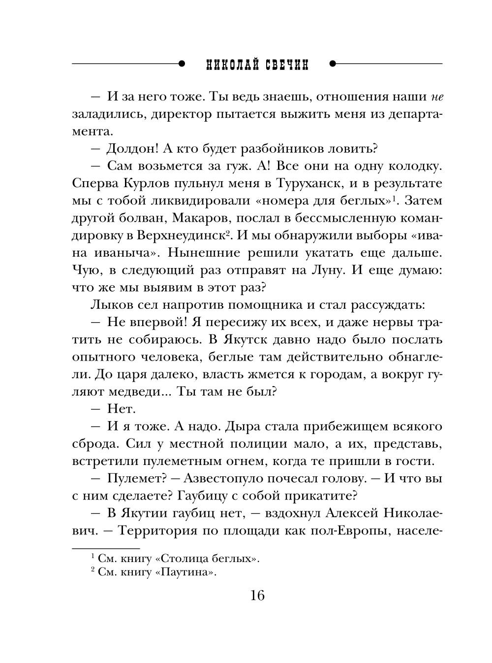 Стильная серия модного автора ретро-детективов Николая Свечина. Книга станет подарком для всех ценителей остросюжетного жанра! Николай Свечин - один из самых известных авторов исторических детективов, номинант премии «Русский детектив» и лидер в своей нише. Самая знаменитая серия Свечина - серия про расследования Алексея Лыкова. Она насчитывает уже более 30 романов и сборников, в каждом из которых - отдельная история преступлений, но узнаваемые герои. Эффект остросюжетного сериала. В этих жутких местах живут лишь ссыльные. Ну как живут. Выживают. Свирепый климат, тайга, полная голодных хищников. Жестокие законы, основанные на праве сильного. И в этот земной ад отправляется выдающийся петербуржский сыщик Алексей Николаевич Лыков. Ему поручено найти затерявшийся в горах поселок, который не значится ни на одной карте. Но за которым тянется шлейф дурных, очень нехороших слухов. Говорят, в поселке бесследно исчезают люди - по полсотни за год. Уходят туда - и с концами. Ни слуху, ни духу. Но что совершенно не укладывается в голове: внезапно союзником Лыкова становится крестный отец петербуржской преступности, «русский профессор Мориарти» Илларион Рудайтис по прозвищу Сорокоум. Этот дьявол во плоти пообещал сыщику любую помощь и деньги, лишь бы тот добрался до таинственного места и разыскал там родного брата Сорокоума Михаила…| Издательство | Эксмо |