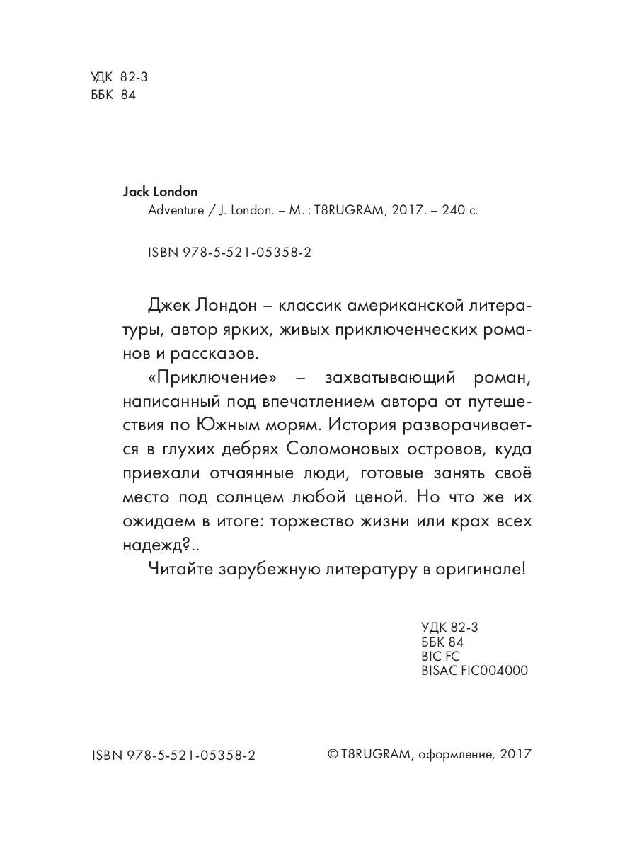 «Приключение» - захватывающий роман, написанный под впечатлением автора от путешествия по Южным морям. История разворачивается в глухих дебрях Соломоновых островов, куда приехали отчаянные люди, готовые занять своё место под солнцем любой ценой. Но что же их ожидает в итоге: торжество жизни или крах всех надежд?..