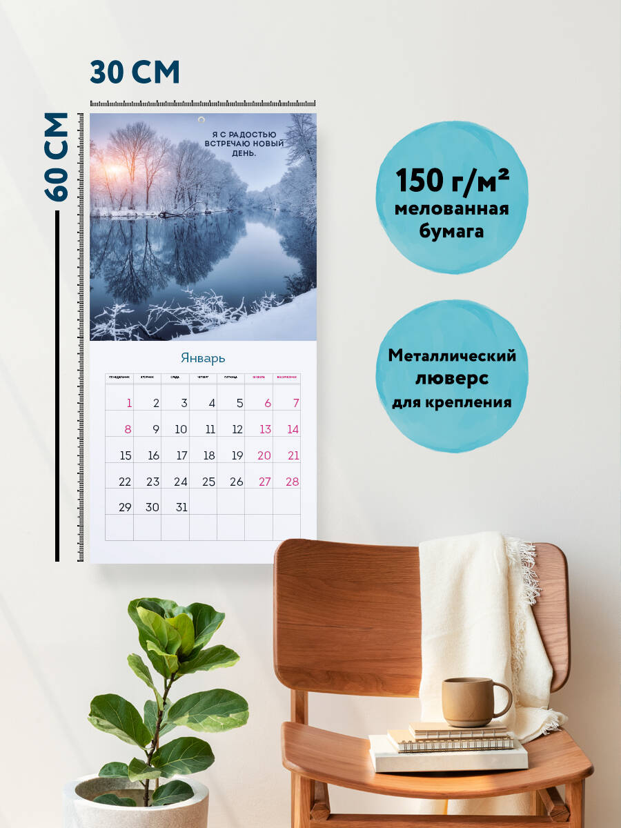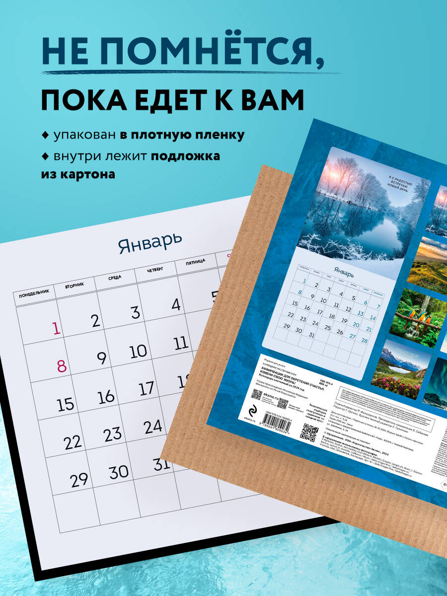 О серии: Наши настенные календари отличаются высоким качеством исполнения! Тщательно подобранные иллюстрации, напечатанные на глянцевой бумаге высочайшего качества, станут настоящим украшением дома, а в календарной сетке найдется место для ваших планов: большие клетки позволят делать записи и организовать свой год! В календаре также отмечены все государственные праздники. В серии настенных календарей издательства «ЭКСМО» каждый найдет тему по вкусу: великие художники, великолепные подборки с самыми знаменитыми произведениями искусства, легендарные кинематографические саги и игры, главные книжные авторы и бестселлеры, фотографии и иллюстрации любимых животных и многое-многое другое! О календаре: Настройтесь на изобильный, радосный и наполенный энергией год! С медитативными фотографиями природы и ресурсными аффирмациями ваш год пройдет так, как вы того захотите. Созерцательные и вдохновляющие картины природы заряжают энергией, а вдохновляющие цитаты, составленные по принципу аффирмаций, напоминают, что важно быть в гармонии с собой и миром, и поддерживают на пути к поставленным целям. Качественная печать и стильный дизайн будут радовать каждый день и прекрасно дополнят любой интерьер. Технические параметры: - Тип календаря - настенный перекидной. - Год - 2024. - Календарная сетка - с разбивкой по месяцам. - Вид скрепления - скрепка. - Ширина - 30 см. - Высота - 30 см. - Внутренний блок - мелованная бумага 150 г/м2. - Подложка - плотный гофрокартон для поддержания формы. - Индивидуальная упаковка в плотный целлофановый пакет.| Издательство | ООО "Издательство "Эксмо" |