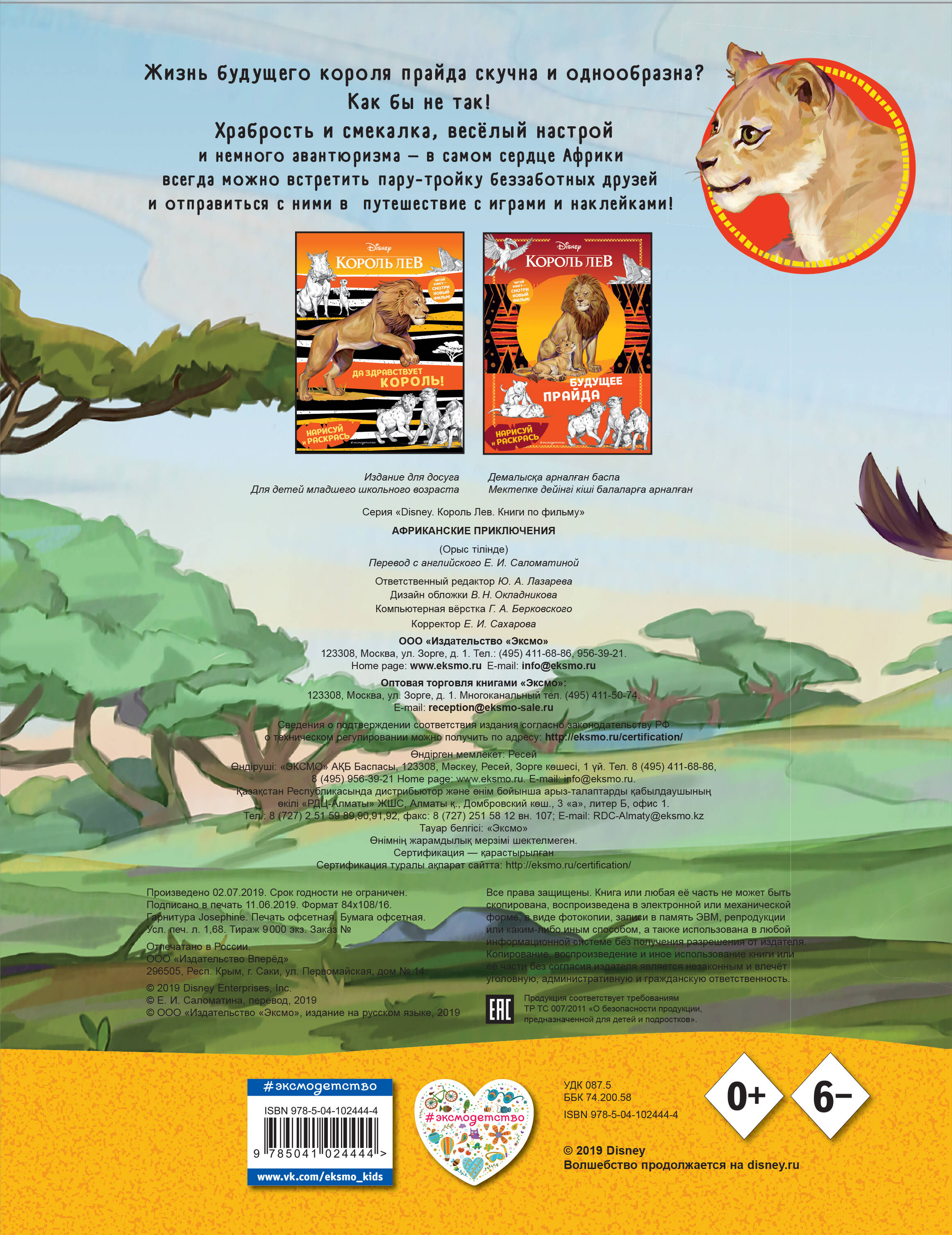Все поклонники затаились в ожидании полнометражной киноадаптации анимационного фильма студии Disney "Король Лев". К выходу фильма издательство подготовило самые разнообразные издания: для преданных поклонников - классика в различных форматах - от кинокомикса с кадрами из любимого мультфильма до подарочного издания с иллюстрациями и эскизами от иллюстраторов, которые работали над классической версией 1994 года. Для юных читателей и зрителей - книжка с играми и наклейками. Новые оригинальные иллюстрации от студии Disney. Игры с заданиями и наклейками - отправляемся в африканские приключения!| Издательство | ООО "Издательство "Эксмо" |