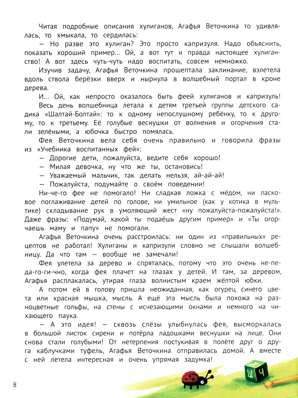He все феи одинаковы. Кто-то опекает котят и цветы, а кто-то... хулиганов! Фея Агафья Веточкина устраивает переполох, выбрав себе такое призвание. Только вот «опекать» - совсем не про неё. Вместе с детьми из грустного садика «Шалтай-Болтай» она отправляется в «капризные» приключения! Герои попробуют суп из котла тролля, вызовут настоящее привидение, сделают весь мир сладким, научатся летать, освоят кошачий язык, поймают солнце на лассо, вызовут оркестр из мартышек, отправятся в садик прямо в ходячем доме, превратятся в рыбу, получат совет от болотного чудища и побывают в жилище великана. Пережив все эти «хулиганские приключения», дети поймут, что их капризы не так уж и нужны. А взрослые увидят, что слово «хулиган» не такое уж «прозрачное»! Только не говорите ребятам об этом заранее, не раскрывайте сюрпризы увлекательных приключений, которые приготовила Агафья Веточкина - находчивая и обаятельная фея хулиганов и капризуль!| Издательство | Феникс |