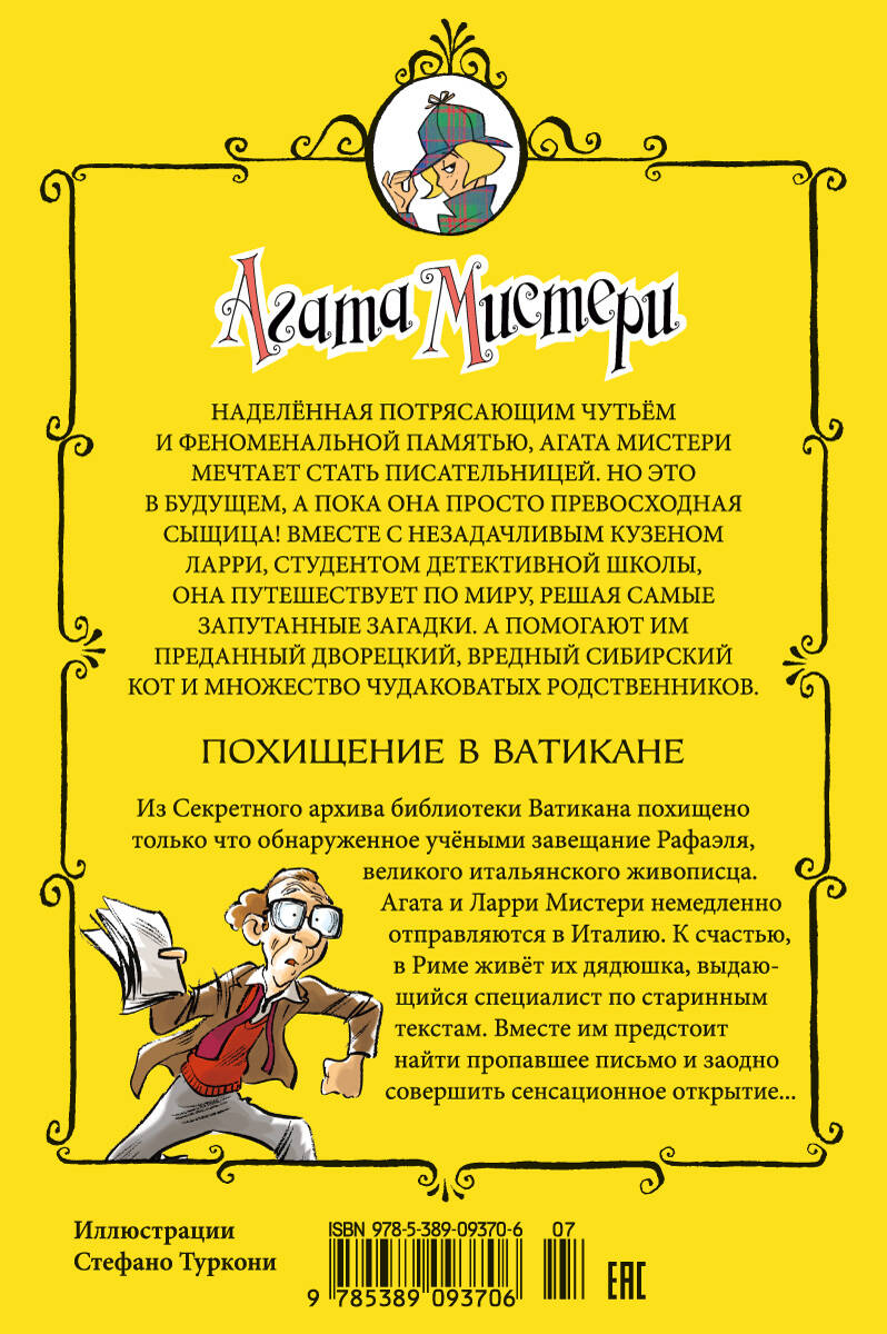 Наделённая потрясающим чутьём и феноменальной памятью, Агата Мистери мечтает стать писательницей. Но это в будущем, а пока она просто превосходная сыщица! Вместе со своим незадачливым кузеном Ларри, студентом детективной школы, она путешествует по миру, чтобы решать самые запутанные загадки. А помогают им преданный дворецкий, вредный сибирский кот и множество чудаковатых родственников. Из Секретного архива библиотеки Ватикана похищен ценнейший документ - только что обнаруженное учёными и ещё даже не расшифрованное завещание Рафаэля, великого итальянского живописца. Агата и Ларри Мистери немедленно отправляются в Италию. К счастью, в Риме живёт их дядюшка, выдающийся специалист по старинным текстам. Вместе им предстоит найти пропавшее письмо и заодно совершить сенсационное открытие...| Издательство | Азбука-Аттикус Издат.группа ООО |