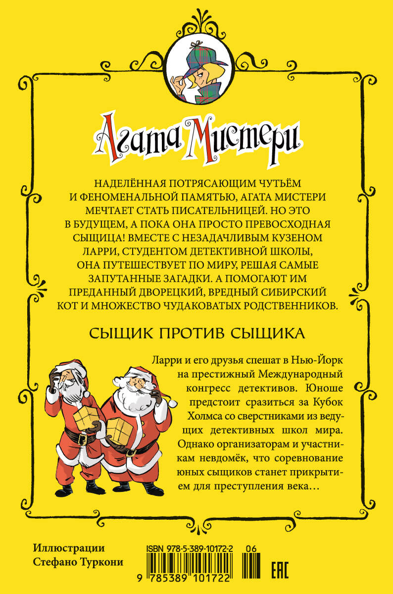 Наделённая потрясающим чутьём и феноменальной памятью, Агата Мистери мечтает стать писательницей. Но это в будущем, а пока она просто превосходная сыщица! Вместе со своим незадачливым кузеном Ларри, студентом детективной школы, она путешествует по миру, чтобы решать самые запутанные загадки. А помогают им преданный дворецкий, вредный сибирский кот и множество чудаковатых родственников. Сыщик против сыщика. Ларри готовится отпраздновать Рождество по-домашнему, в кругу семьи. Но не тут-то было: неожиданно он получает указание спешить в Нью-Йорк на престижный Международный конгресс детективов и принять участие в "Супергонке". Юноше предстоит сразиться за Кубок Холмса со своими сверстниками из ведущих детективных школ мира. Ларри, Агата, мистер Кент и кот Ватсон вылетают в Нью-Йорк, где к их команде присоединяется очередной Мистери - дядя Ким, городской альпинист. Казалось бы, можно на время забыть о преступниках, ведь в этом состязании сыщик играет против сыщика. Однако организаторам и участникам соревнования невдомёк, что в этом году "Супергонка" станет прикрытием для преступления века… Для среднего школьного возраста.| Издательство | Азбука-Аттикус Издат.группа ООО |