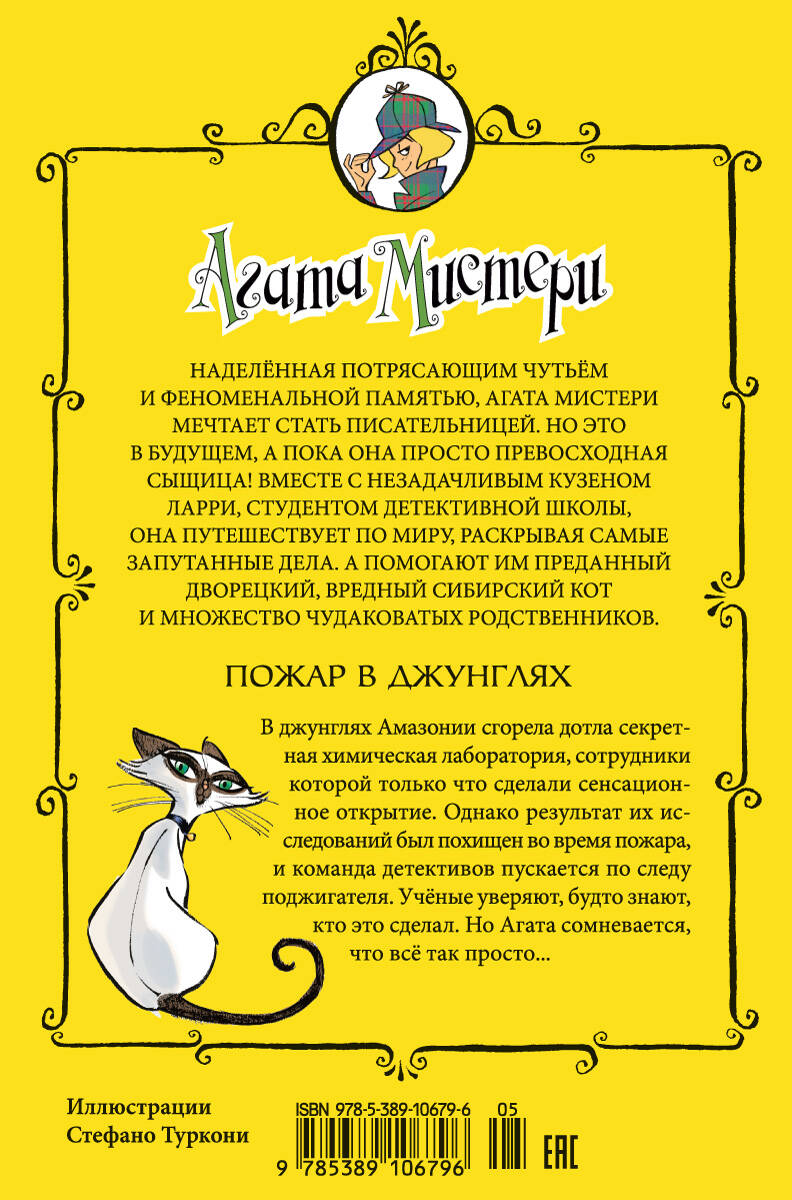 Наделённая потрясающим чутьём и феноменальной памятью, Агата Мистери мечтает стать писательницей. Но это в будущем, а пока она просто превосходная сыщица! Вместе со своим незадачливым кузеном Ларри, студентом детективной школы, она путешествует по миру, чтобы решать самые запутанные загадки. А помогают им преданный дворецкий, вредный сибирский кот и множество чудаковатых родственников. У Ларри новое увлечение - футбол. Бить по мячу он пока толком не научился, зато - вот удача! - его отправляют с очередным заданием в самую футбольную страну мира, в Бразилию! В непроходимых лесах Амазонии неизвестный злоумышленник сжёг дотла химическую лабораторию, где крупная корпорация проводила исследования чрезвычайной важности и секретности. Сотрудники лаборатории только что сделали сенсационное открытие, способное изменить судьбы мира! Однако результат их исследований был похищен во время пожара, и теперь команде детективов предстоит пуститься через полные опасностей джунгли по следу поджигателя. Учёные в один голос уверяют, будто знают, кто это сделал… Но Агата сомневается, что всё так просто, как может показаться на первый взгляд!| Издательство | Азбука-Аттикус Издат.группа ООО |