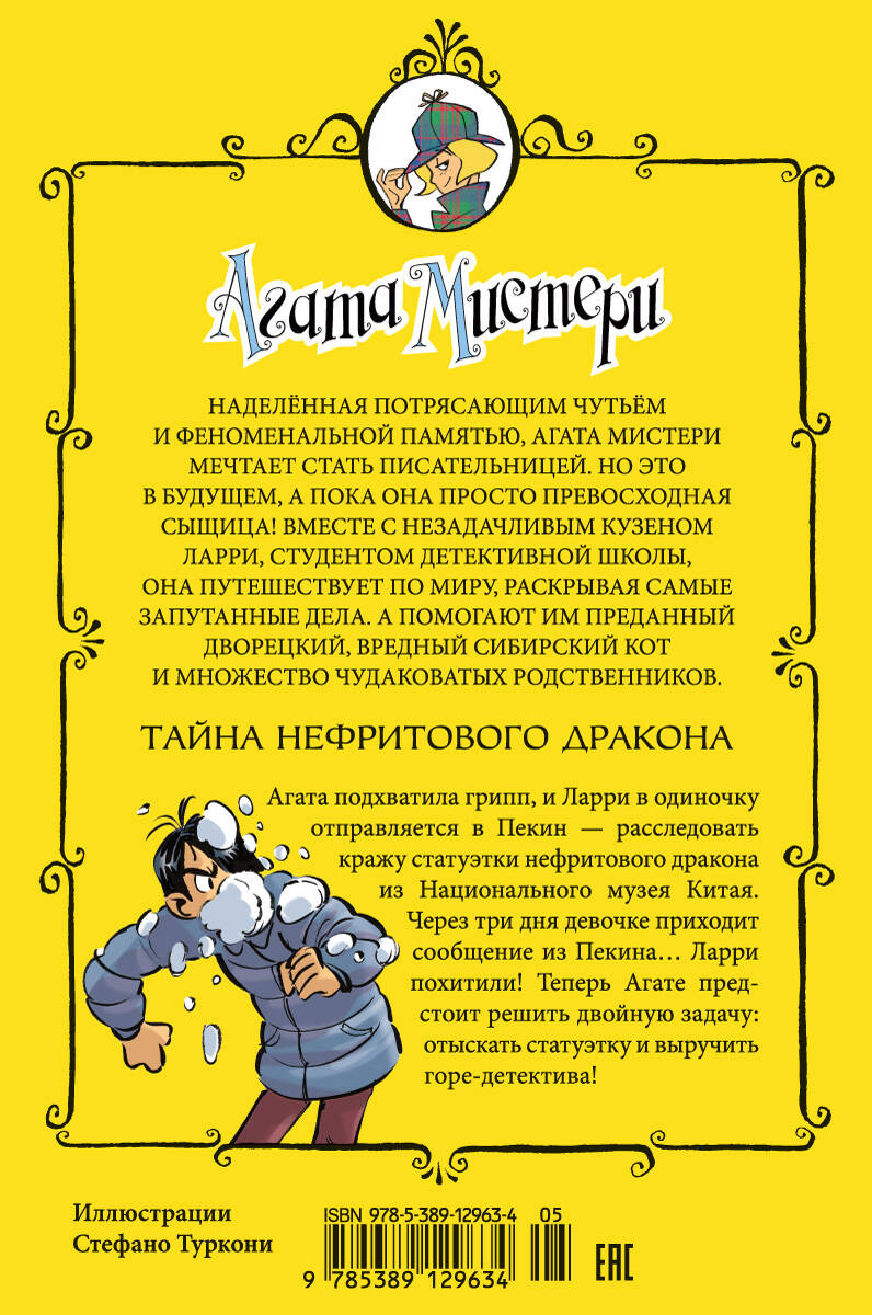 Вот незадача - в новогодние каникулы Агату угораздило подхватить грипп. И всё бы ничего, но Ларри, как назло, отправляют в очередную командировку. На сей раз ему поручают расследовать пропажу статуэтки нефритового дракона, похищенной из Пекинского музея искусств. Впервые в жизни юному детективу придётся действовать в одиночку, без помощи своей гениальной сестрёнки, мистера Кента и своенравного Ватсона. Ларри ближайшим рейсом вылетает в Пекин, и спустя три дня Агата получает от брата сообщение… Ларри похитили! Теперь Агате и её друзьям предстоит решить двойную задачу: отыскать статуэтку дракона и выручить бедолагу Ларри!| Издательство | Азбука-Аттикус Издат.группа ООО |
