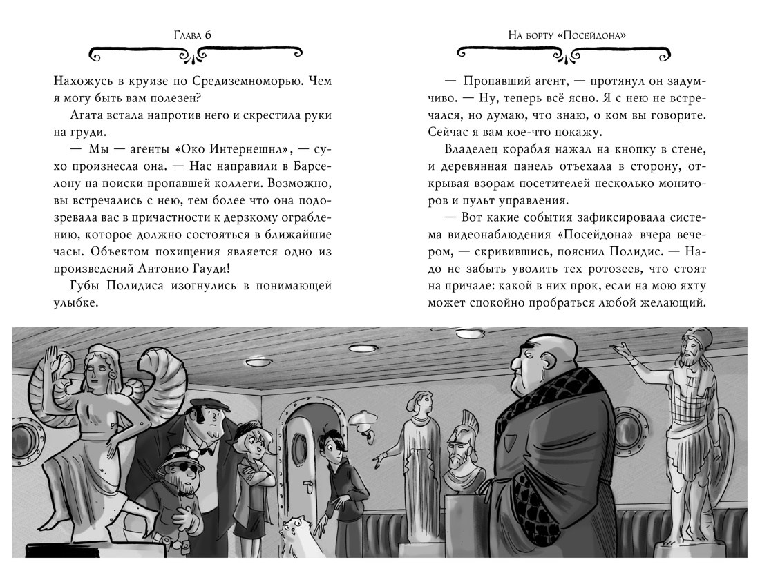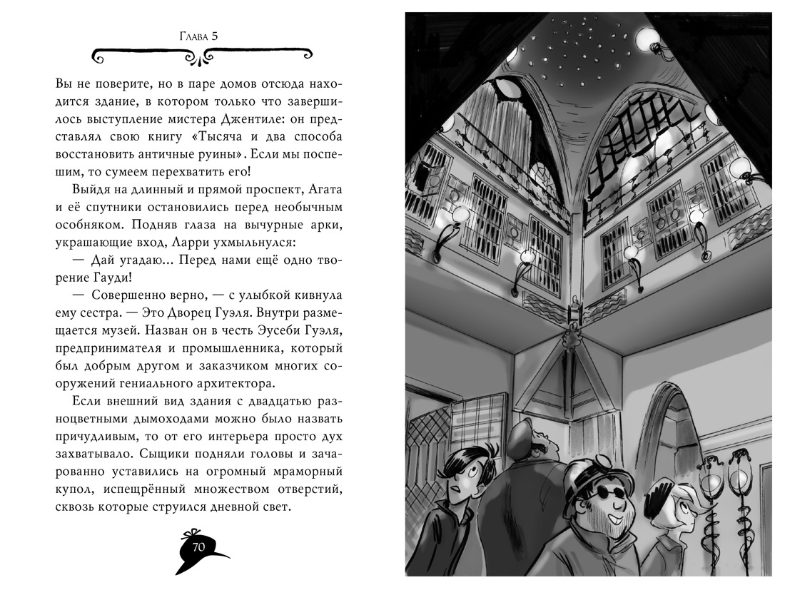 Наделённая потрясающим чутьём и феноменальной памятью, Агата Мистери мечтает стать писательницей. Но это в будущем, а пока она просто превосходная сыщица! Вместе со своим незадачливым кузеном Ларри, студентом детективной школы, она путешествует по миру, чтобы решать самые запутанные загадки. А помогают им преданный дворецкий, вредный сибирский кот и множество чудаковатых родственников. В один ненастный день накануне сложного экзамена Ларри Мистери получает неожиданное и совершенно секретное поручение от своего преподавателя в школе детективов. Чтобы выполнить задание, он должен отправиться в Барселону, где никогда не был, встретиться там с человеком, которого никогда не видел, и передать ему пакет, содержимое которого ему неизвестно. Помощь в таком непростом деле никогда не помешает, а кто лучше Агаты, будущей знаменитой писательницы детективных романов, разбирается во всяких хитросплетениях и загадках? А загадки начинают сыпаться на друзей сразу же по прибытии в прекрасный город на испанском побережье, знаменитый архитектурными шедеврами Антонио Гауди. И один из этих шедевров находится в нешуточной опасности, которую наши герои просто обязаны предотвратить!| Издательство | Азбука |