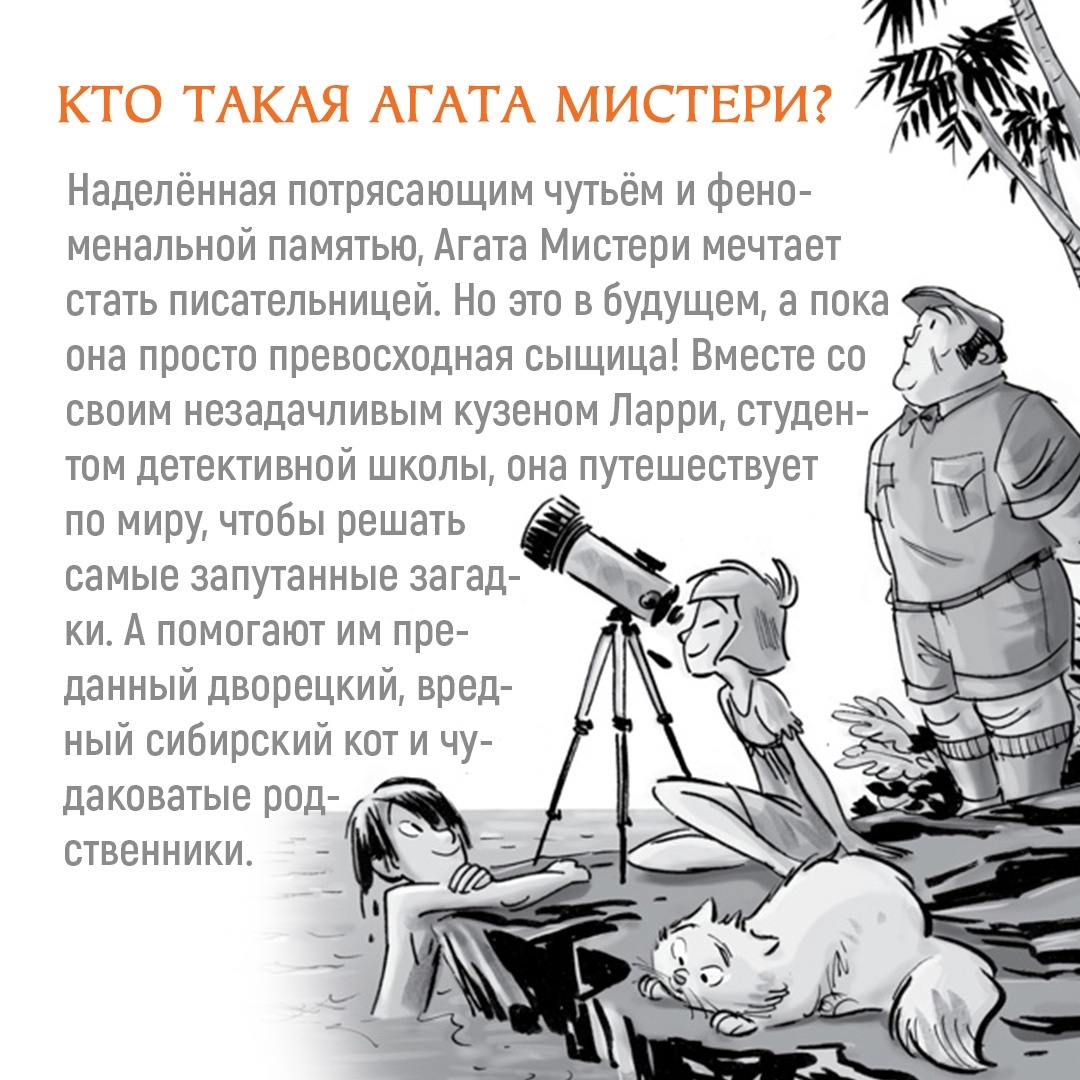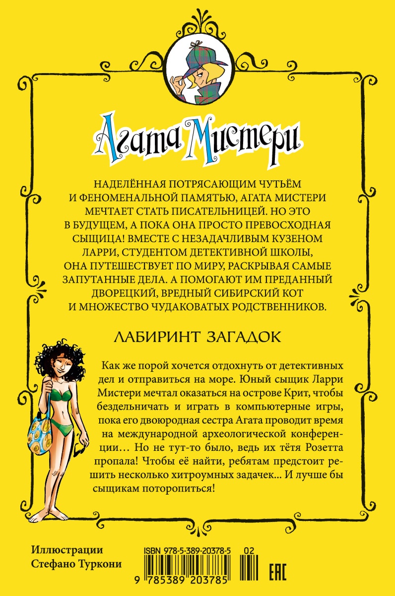 Наделённая потрясающим чутьём и феноменальной памятью, Агата Мистери мечтает стать писательницей. Но это в будущем, а пока она просто превосходная сыщица! Вместе со своим кузеном Ларри, студентом детективной школы, она путешествует по миру, чтобы решать самые запутанные загадки. А помогают им преданный дворецкий, вредный сибирский кот и множество чудаковатых родственников. Лабиринт загадок. Только собрался Ларри Мистери отдохнуть от учёбы на море, как оказался втянут в опасное расследование. Да не один, а со своей двоюродной сестрой Агатой! Тётя Розетта, которая обещала встретить подростков на острове Крит, пропала без вести. Вместо неё около дворца Миноса подростки обнаружили таинственную записку с первой подсказкой и призывом найти тётушку. Вдобавок ко всему таинственный похититель взломал портативный компьютер Ларри и теперь от умного устройства никакого толку. Вместо того чтобы искать полезную информацию, «ИнтерОко» подкидывает брату и сестре логические задачки, которые надо решить за ограниченное время, и задает каверзные вопросы. Удастся ли юным сыщикам спасти тётю Розетту, пока не стало слишком поздно?| Издательство | Азбука |