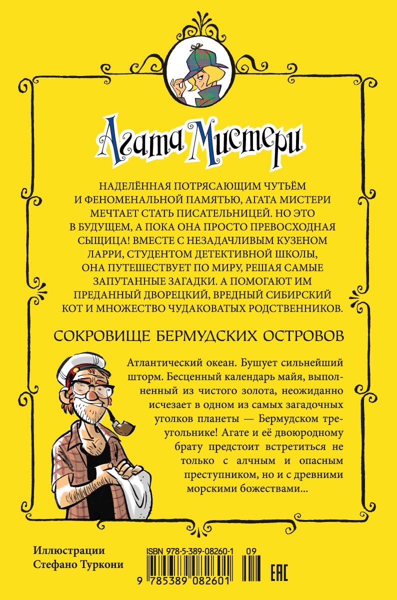 Наделённая потрясающим чутьём и феноменальной памятью, Агата Мистери мечтает стать писательницей. Но это в будущем, а пока она просто превосходная сыщица! Вместе со своим незадачливым братом Ларри, студентом детективной школы, она путешествует по миру, чтобы решать самые запутанные загадки. А помогают им преданный дворецкий, вредный сибирский кот и множество чудаковатых родственников. Сокровище Бермудских островов. Атлантический океан. Бушует сильнейший шторм. Бесценный календарь майя, выполненный из чистого золота, неожиданно исчезает в одном из самых загадочных уголков планеты - Бермудском треугольнике! Агате и её двоюродному брату предстоит встретиться не только с алчным и опасным преступником, но и с древними морскими божествами...
