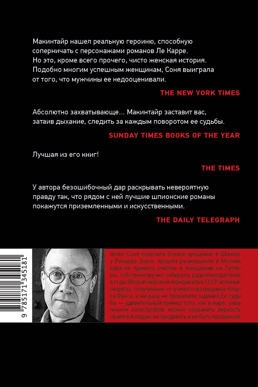 Бен Макинтайр рассказывает об удивительной жизни советской шпионки Урсулы Кучински, опираясь на ее собственные записи и письма. Получив удар дубинкой на коммунистической демонстрации в Берлине, шестнадцатилетняя Урсула встает на путь, который навсегда определяет траекторию ее жизни. Она начинает с работы в книжном магазине, продавая марксистскую литературу, и не подозревает, какую роль она сыграет в мировой истории. Выйдя замуж, она переезжает в Шанхай и ведет там светскую жизнь, изнывая от скуки. Вскоре, однако, размеренной жизни приходит конец: она знакомится со "звездой" советской разведки Рихардом Зорге, и дом простой немецкой домохозяйки превращается в коммунистическое подполье. С этого момента Урсула навсегда связывает свою судьбу со шпионажем и получает кодовое имя "Соня". В книге показан весь путь Урсулы Кучински от простой подчиненной до опытной разведчицы. Бен Макинтайр мастерски раскрывает многогранность ее жизни и связанные с этим внутренние конфликты. Долг перед идеей и перед семьей, любовь и разлука, страх преследования и неутомимое жизнелюбие - все это составляет жизнь удивительной женщины, которой удалось сохранить себя в самом эпицентре катастроф двадцатого века.