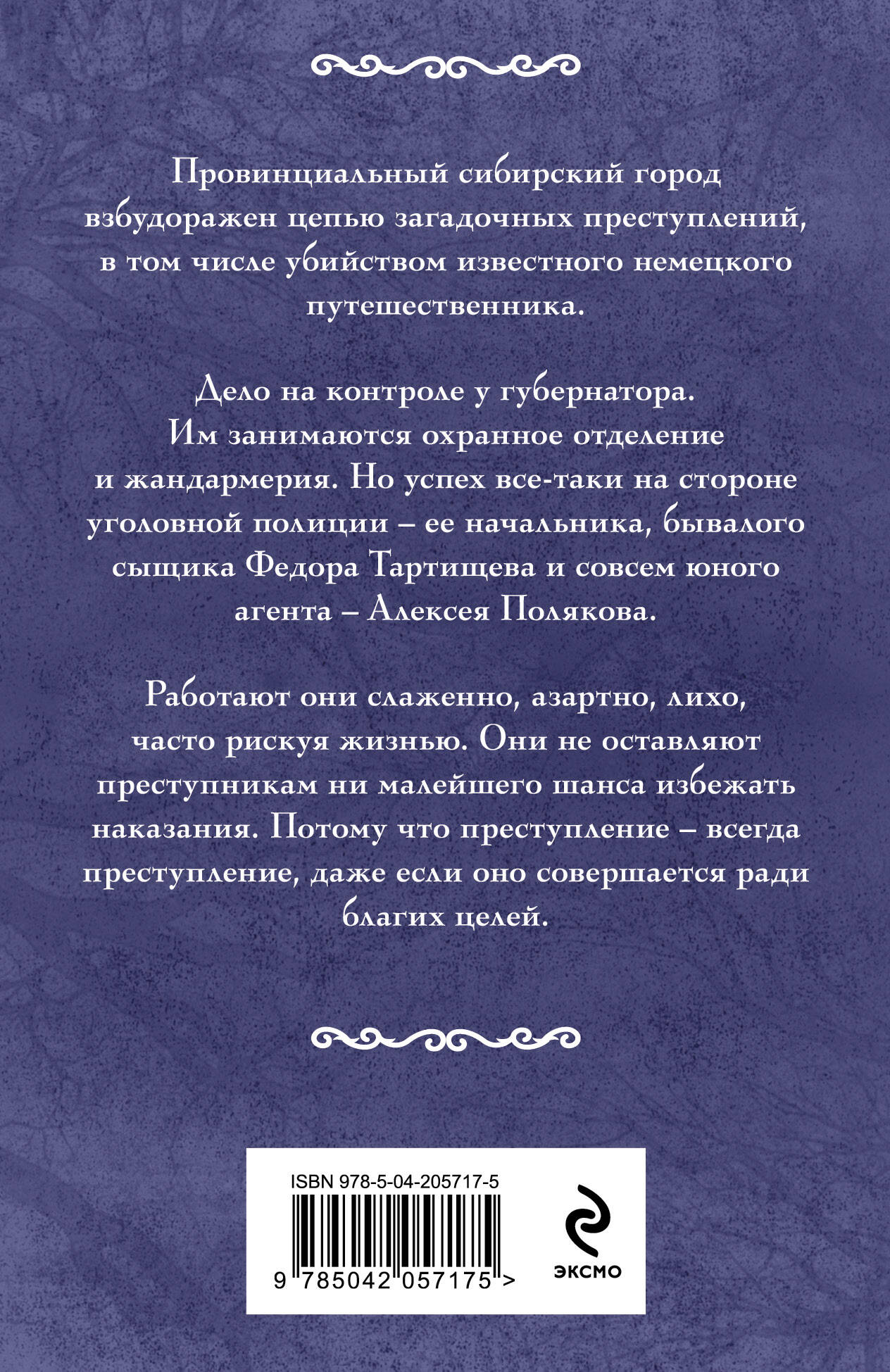 Провинциальный сибирский город взбудоражен цепью загадочных преступлений, в том числе убийством известного немецкого путешественника. Дело на контроле у губернатора. Им занимаются охранное отделение и жандармерия. Но успех все-таки на стороне уголовной полиции - ее начальника, бывалого сыщика Федора Тартищева и совсем юного агента - Алексея Полякова. Работают они слаженно, азартно, лихо, часто рискуя жизнью. Они не оставляют преступникам ни малейшего шанса избежать наказания. Потому что преступление - всегда преступление, даже если оно совершается ради благих целей.| Издательство | ООО "Издательство "Эксмо" |