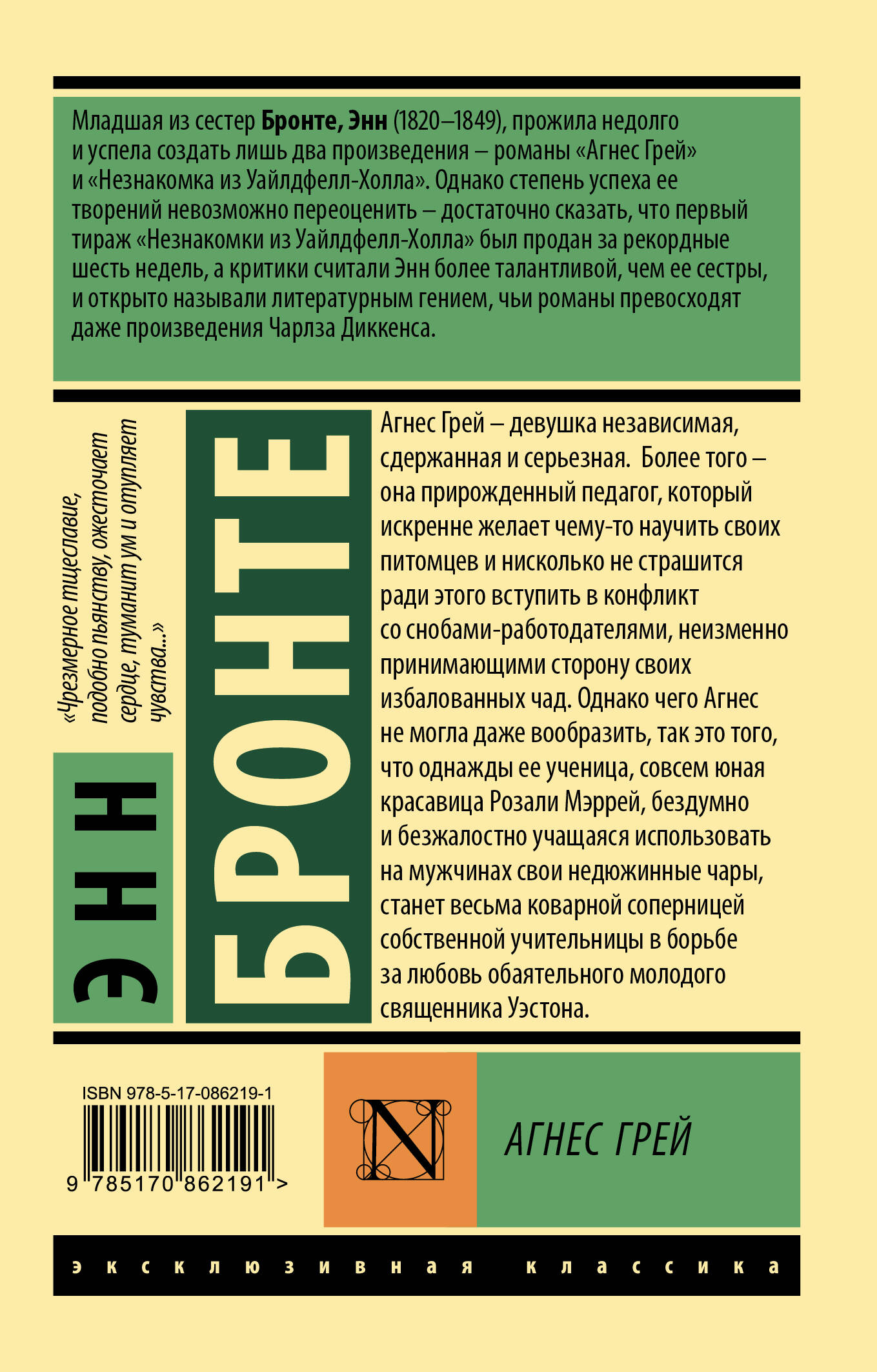 Агнес Грей - девушка независимая, сдержанная и серьезная. Более того - она прирожденный педагог, который искренне желает чему-то научить своих питомцев и нисколько не страшится ради этого вступить в конфликт со снобами-работодателями, неизменно принимающими сторону своих избалованных чад. Однако чего Агнес не могла даже вообразить, так это того, что однажды ее ученица, совсем юная красавица Розали Мэррей, бездумно и безжалостно учащаяся использовать на мужчинах свои недюжинные чары, станет весьма коварной соперницей собственной учительницы в борьбе за любовь обаятельного молодого священника Уэстона.| Издательство | Издательство "АСТ" |