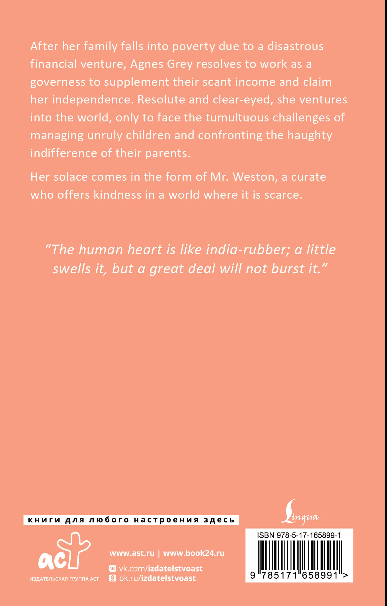 Неудачное финансовое вложение ставит семью Грей на порог бедности, и Агнес, движимая желанием помочь родным, решает устроиться горничной в богатую семью. Полная веры в человеческое благородство и доброту, юная леди отправляется в мир, в котором дети грубы и избалованы, а заносчивые родители принимают горничную за судомойку. Утешением для неё становится священник мистер Уэстон - единственный просвещенный и чуткий человек в ее отныне хладнокровном и безжалостном окружении. "Агнес Грей" - роман Энн Бронте, младшей из трех прославленных сестер. Классика английской литературы, книга понравится всем поклонникам Джейн Остин и Шарлотты Бронте - а также всем, кто любит читать неадаптированную прозу на английском языке.| Издательство | Издательство "АСТ" |