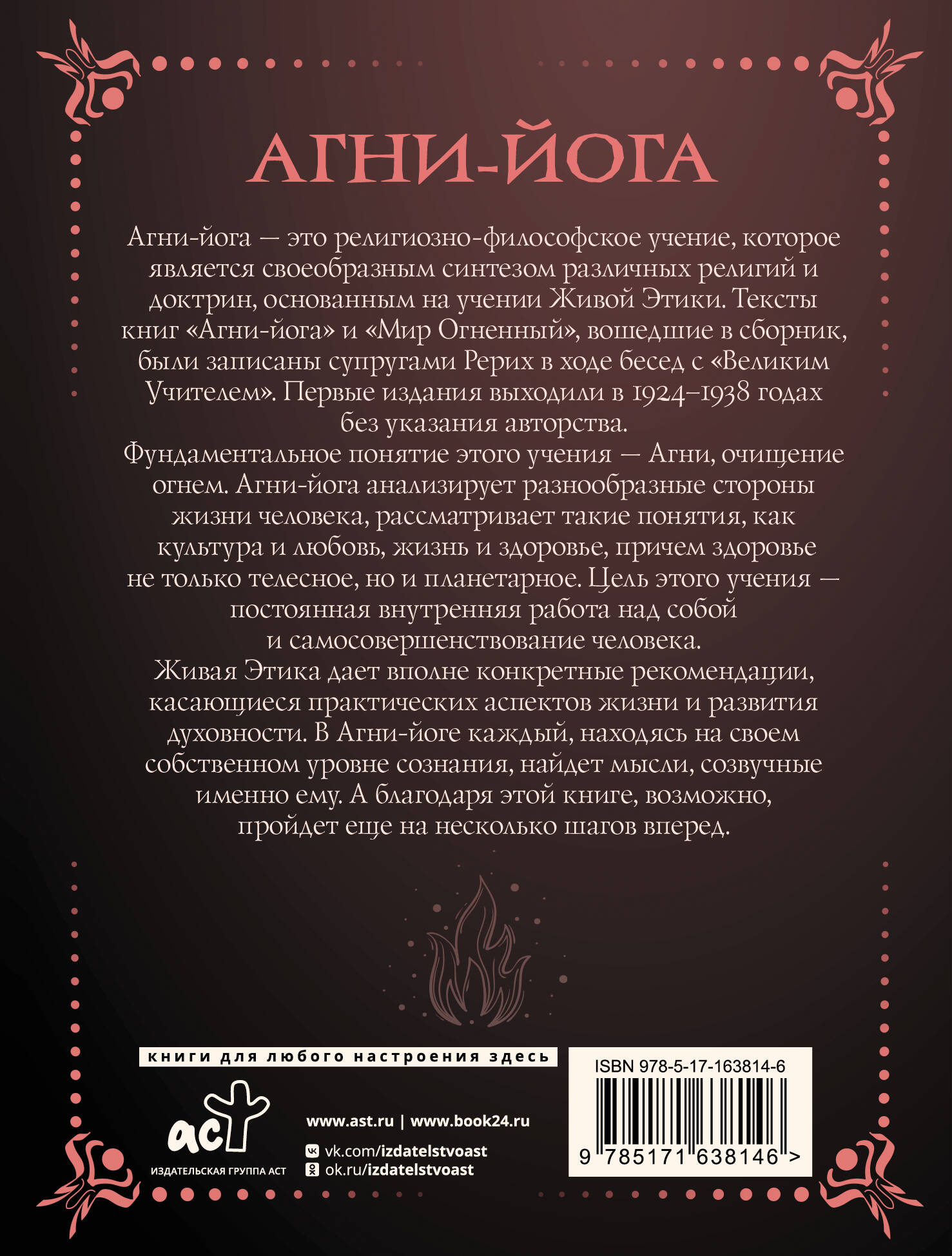 Агни-йога - это религиозно-философское учение, которое является своеобразным синтезом различных религий и доктрин, основанным на учении Живой Этики. Тексты книг "Агни-йога" и "Мир Огненный", вошедшие в сборник, были записаны супругами Рерих в ходе бесед с "Великим Учителем". Первые издания выходили в 1924-1938 годах без указания авторства. Фундаментальное понятие этого учения - Агни, очищение огнем. Агни-йога анализирует разнообразные стороны жизни человека, рассматривает такие понятия, как культура и любовь, жизнь и здоровье, причем здоровье не только телесное, но и планетарное. Цель этого учения - постоянная внутренняя работа над собой и самосовершенствование человека. Живая Этика дает вполне конкретные рекомендации, касающиеся практических аспектов жизни и развития духовности. В Агни-йоге каждый, находясь на своем собственном уровне сознания, найдет мысли, созвучные именно ему. А благодаря этой книге, возможно, пройдет еще на несколько шагов вперед.| Издательство | Издательство "АСТ" |