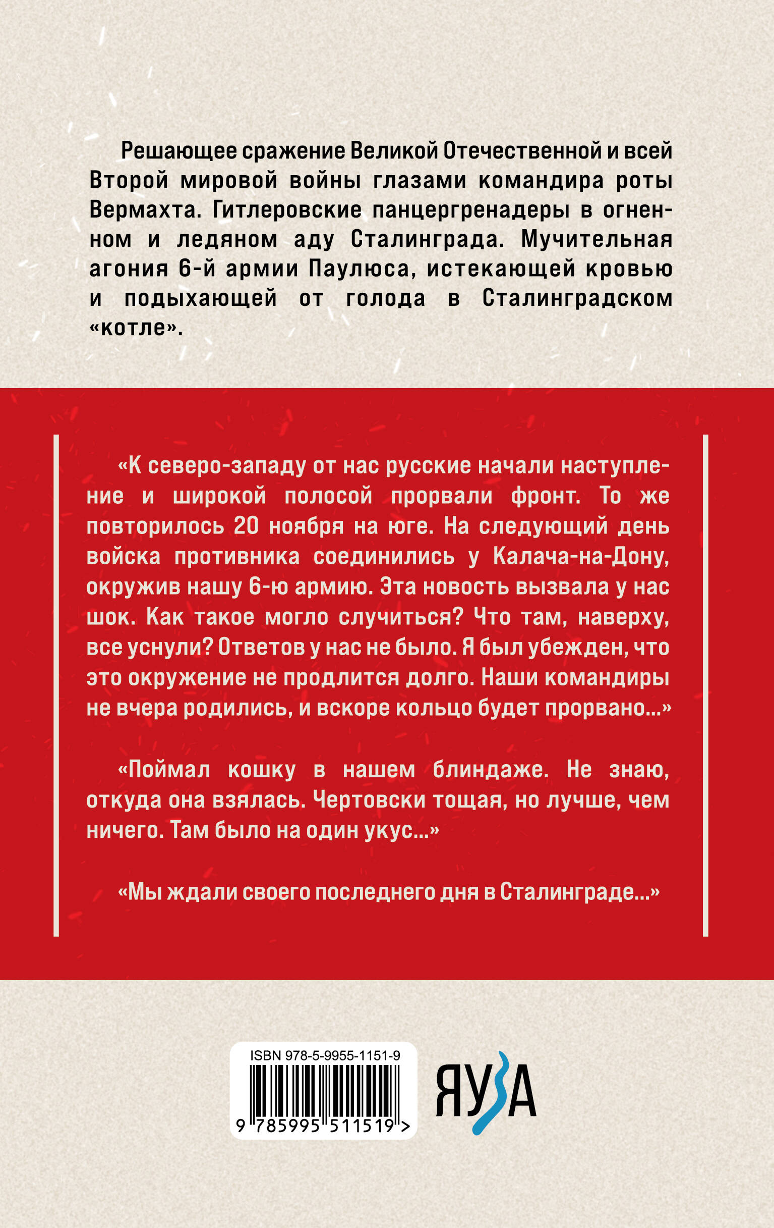 Решающее сражение Великой Отечественной и всей Второй мировой войны глазами командира роты Вермахта. Гитлеровские панцергренадеры в огненном и ледяном аду Сталинграда. Мучительная агония 6-й армии Паулюса, истекающей кровью и подыхающей от голода в Сталинградском «котле». «К северо-западу от нас русские начали наступление и широкой полосой прорвали фронт. То же повторилось 20 ноября на юге. На следующий день войска противника соединились у Калача-на-Дону, окружив нашу 6-ю армию. Эта новость вызвала у нас шок. Как такое могло случиться? Что там, наверху, все уснули? Ответов у нас не было. Я был убежден, что это окружение не продлится долго. Наши командиры не вчера родились, и вскоре кольцо будет прорвано…» «Поймал кошку в нашем блиндаже. Не знаю, откуда она взялась. Чертовски тощая, но лучше, чем ничего. Там было на один укус…» «Мы ждали своего последнего дня в Сталинграде…»| Издательство | Яуза-пресс ООО |