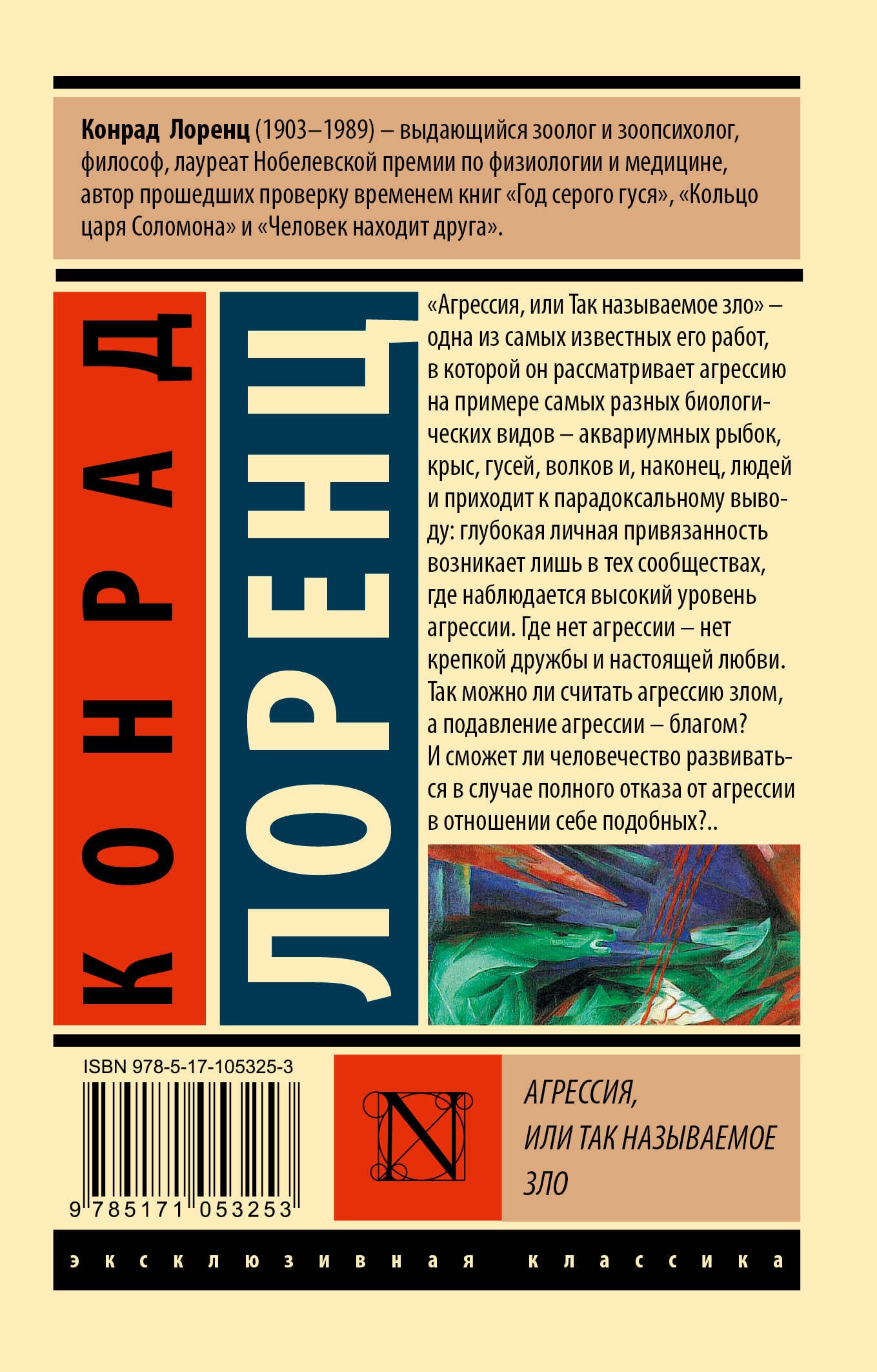 Конрад Лоренц - выдающийся зоолог и зоопсихолог, философ, лауреат Нобелевской премии по физиологии и медицине. "Агрессия, или Так называемое зло" - одна из самых известных его работ, в которой он рассматривает агрессию на примере самых разных биологических видов - аквариумных рыбок, крыс, гусей, волков и, наконец, людей и приходит к парадоксальному выводу: глубокая личная привязанность возникает лишь в тех сообществах, где наблюдается высокий уровень агрессии. Где нет агрессии - нет крепкой дружбы и настоящей любви. Так можно ли считать агрессию злом, а подавление агрессии - благом? И сможет ли человечество развиваться в случае полного отказа от агрессии в отношении себе подобных?..