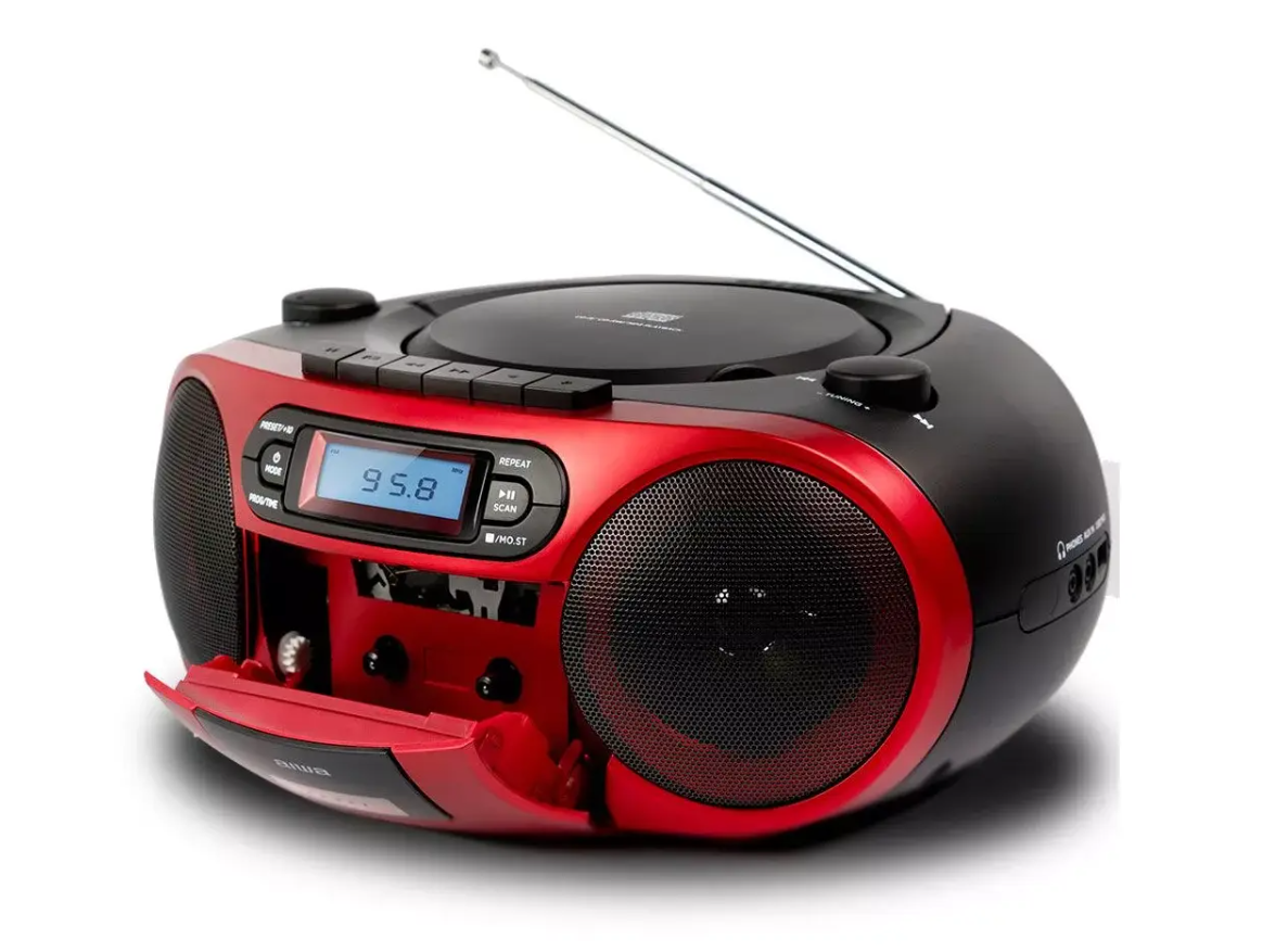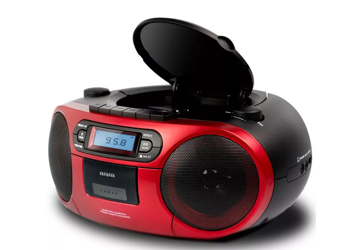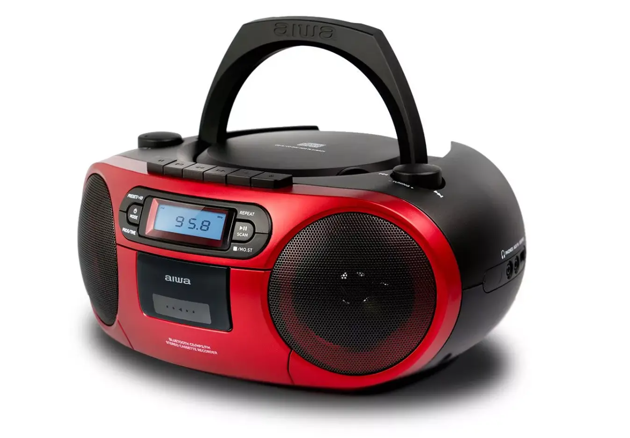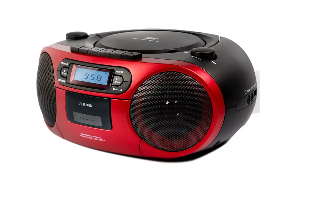 Портативный CD-плеер Aiwa BBTC-550RD в красном корпусе. Поддерживает воспроизведение CD, CD-R и CD-RW. Оснащён функциями повторного воспроизведения, перемешивания треков и программирования порядка треков. Имеет встроенный динамик и возможность подключения наушников, работает от батарей или сети. Компактный дизайн обеспечивает удобство переноски.