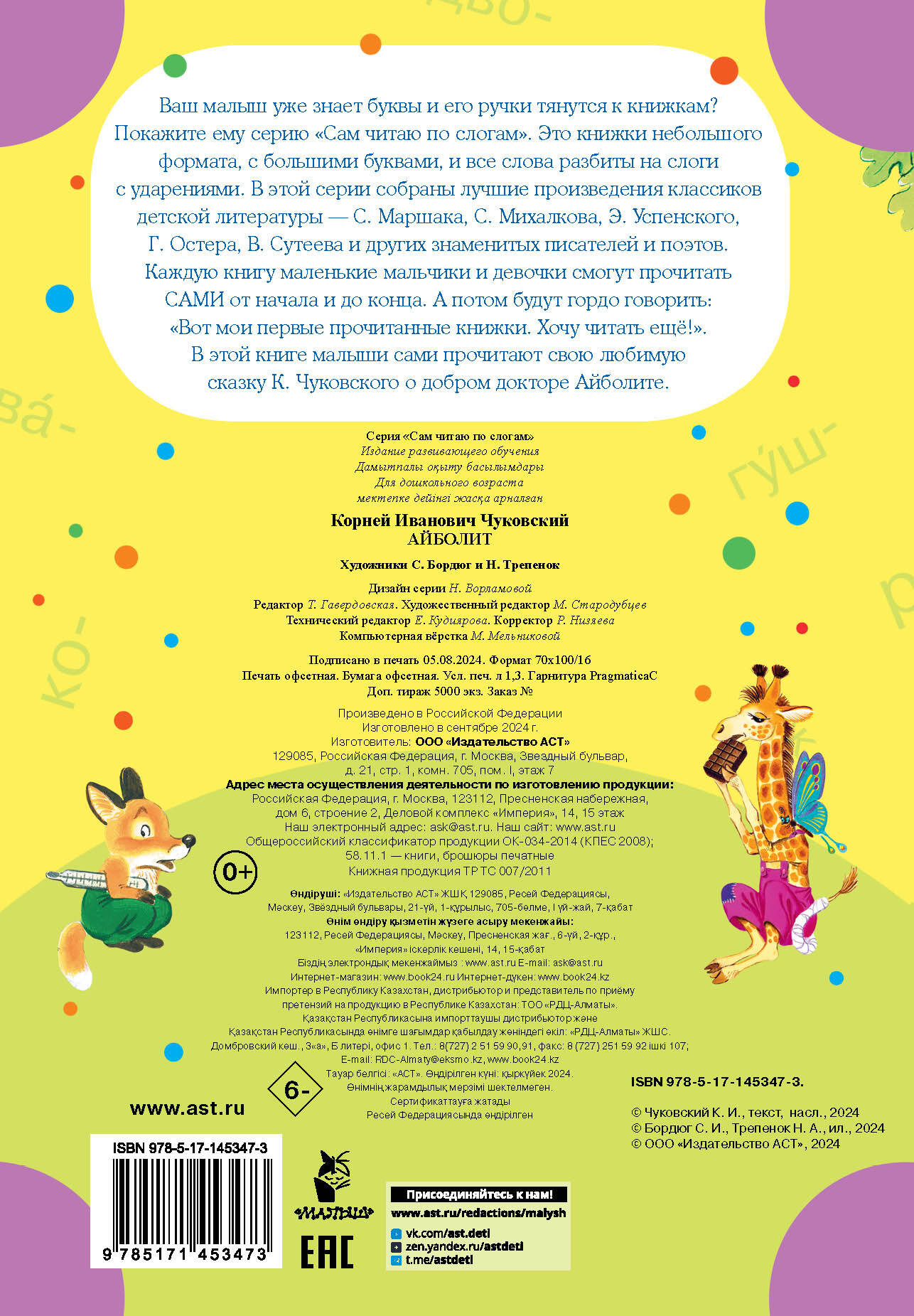 Ваш малыш уже знает буквы и его ручки тянутся к книжкам? Покажите ему серию «Сам читаю по слогам». Это книжки небольшого формата, с большими буквами, и все слова разбиты на слоги с ударениями. В этой серии собраны лучшие произведения классиков детской литературы - С. Маршака, С. Михалкова, Э. Успенского, Г. Остера, В. Сутеева и других знаменитых писателей и поэтов. Каждую книгу маленькие мальчики и девочки смогут прочитать сами от начала и до конца. А потом будут гордо говорить: «Вот мои первые прочитанные книжки. Хочу читать ещё!». В этой книге малыши сами прочитают свою любимую сказку К. Чуковского о добром докторе Айболите. Для дошкольного возраста.| Издательство | ИЗДАТЕЛЬСТВО "АСТ" |