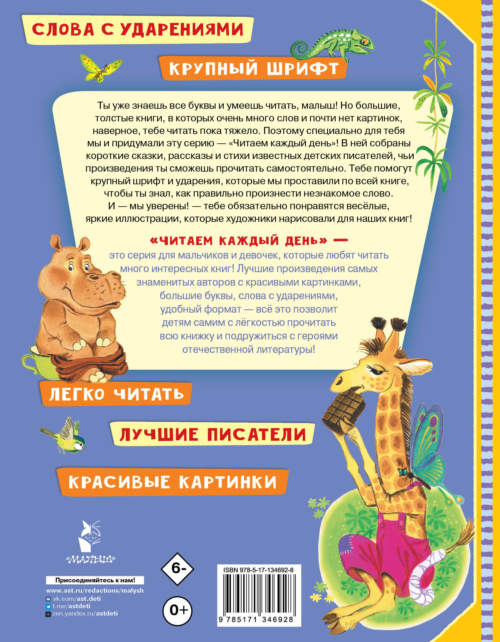 Ты уже знаешь все буквы и умеешь читать, малыш! Но большие, толстые книги, в которых очень много слов и почти нет картинок, наверное, тебе читать пока тяжело. Поэтому специально для тебя мы и придумали эту серию - «Читаем каждый день»! В ней собраны короткие сказки, рассказы и стихи известных детских писателей, чьи произведения ты сможешь прочитать самостоятельно. Тебе помогут крупный шрифт и ударения, которые мы проставили по всей книге, чтобы ты знал, как правильно произнести незнакомое слово. И - мы уверены! - тебе обязательно понравятся весёлые, яркие иллюстрации, которые художники нарисовали для наших книг!| Издательство | ИЗДАТЕЛЬСТВО "АСТ" |