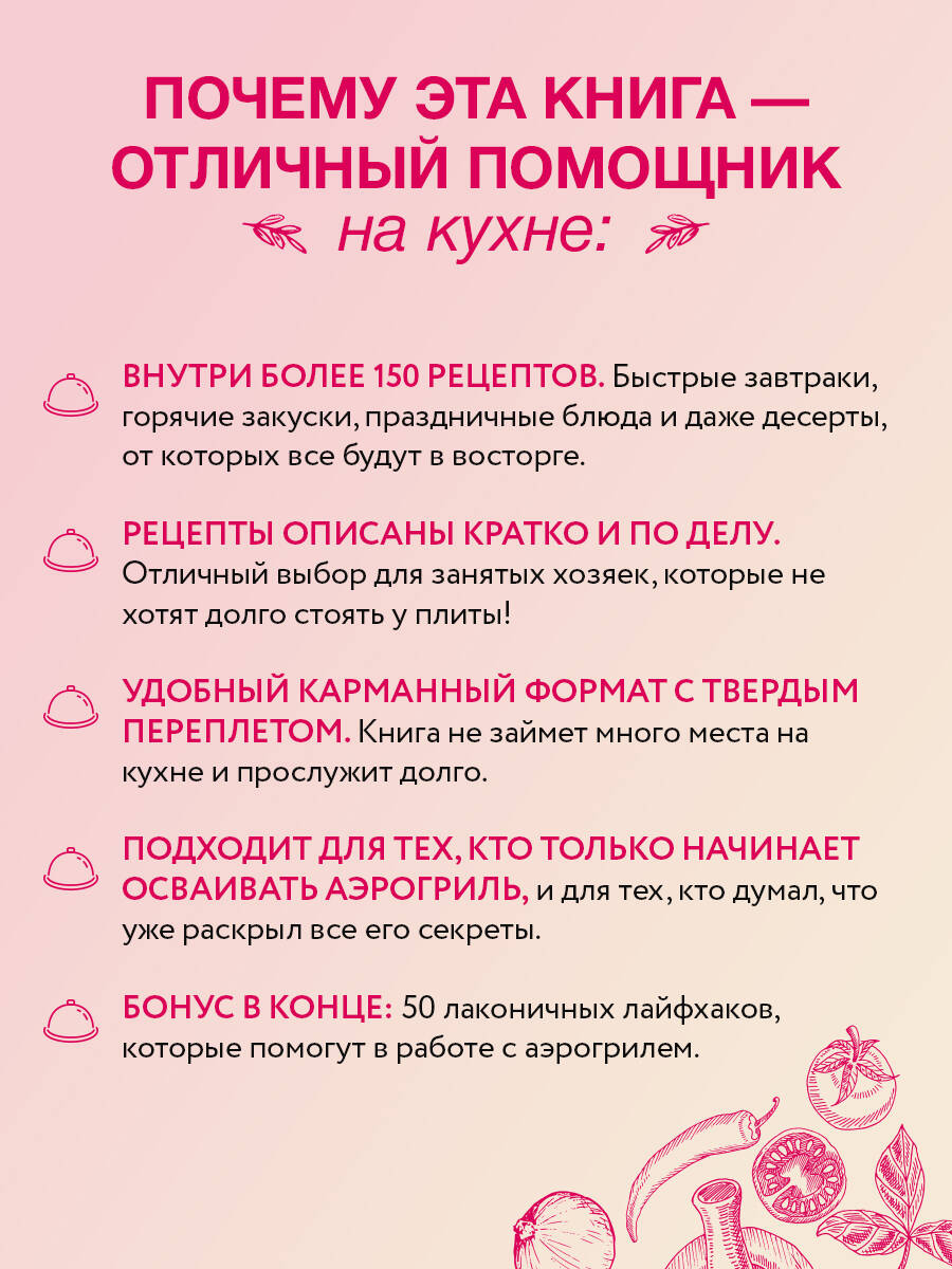 Аэрогриль - это революционное устройство, постепенно захватывающее кухни по всему миру, которое позволяет готовить блюда с минимальным количеством жира, сохраняя при этом их сочность и аромат. Откройте для себя рецепты как для повседневного меню, так и для праздничного стола, экспериментируйте с различными новыми вкусами и текстурами и взгляните на процесс готовки уже знакомых блюд по-новому!| Издательство | Издательство "АСТ" |