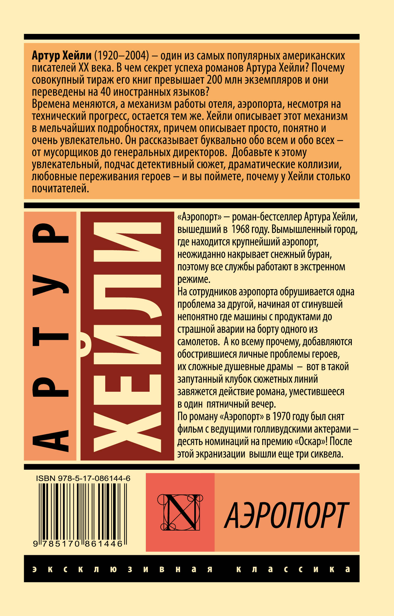 "Аэропорт" - роман-бестселлер Артура Хейли, вышедший в 1968 году. Вымышленный город, где находится крупнейший аэропорт, неожиданно накрывает снежный буран, поэтому все службы работают в экстренном режиме. На сотрудников аэропорта обрушивается одна проблема за другой, начиная от сгинувшей непонятно где машины с продуктами до страшной аварии на борту одного из самолетов. А ко всему прочему добавляются обострившиеся личные проблемы героев, их сложные душевные драмы - вот в такой запутанный клубок сюжетных линий завяжется действие романа, уместившееся в один пятничный вечер. По роману "Аэропорт" в 1970 году был снят фильм с ведущими голливудскими актерами - десять номинаций на премию "Оскар"! После этой экранизации вышли еще три сиквела.| Издательство | ИЗДАТЕЛЬСТВО "АСТ" |